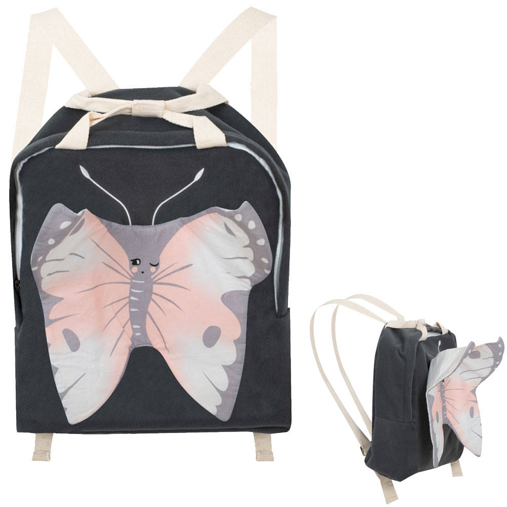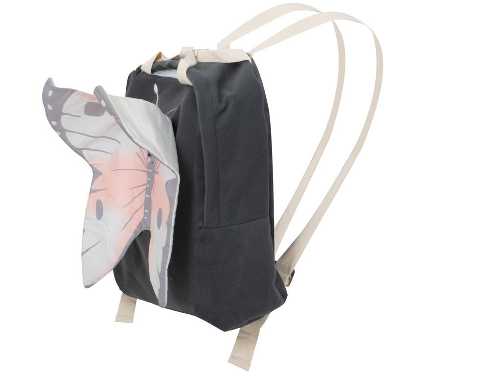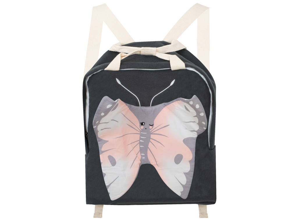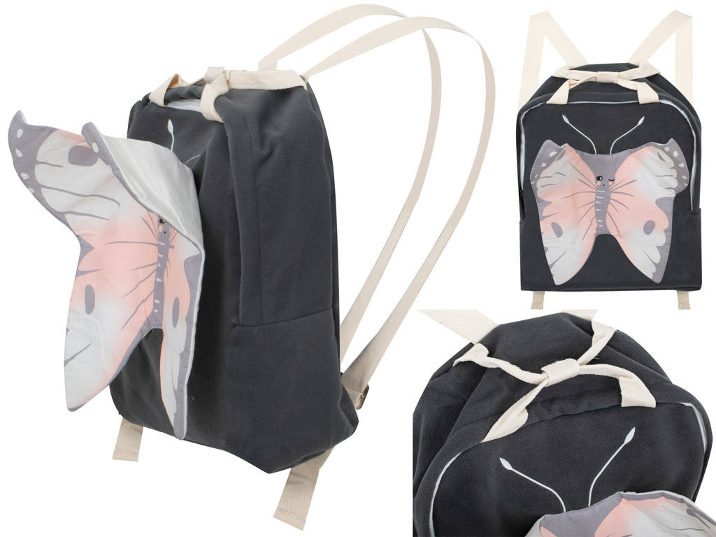 - Uroczy motyl usiadł na szarym plecaczku i ma ochotę na na wycieczkę do przedszkola. Plecak jest jednokomorowy i do tego zapinany na zamek błyskawiczny.