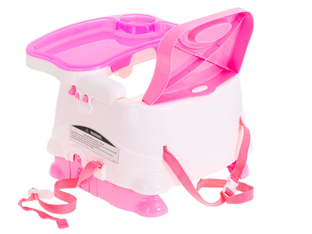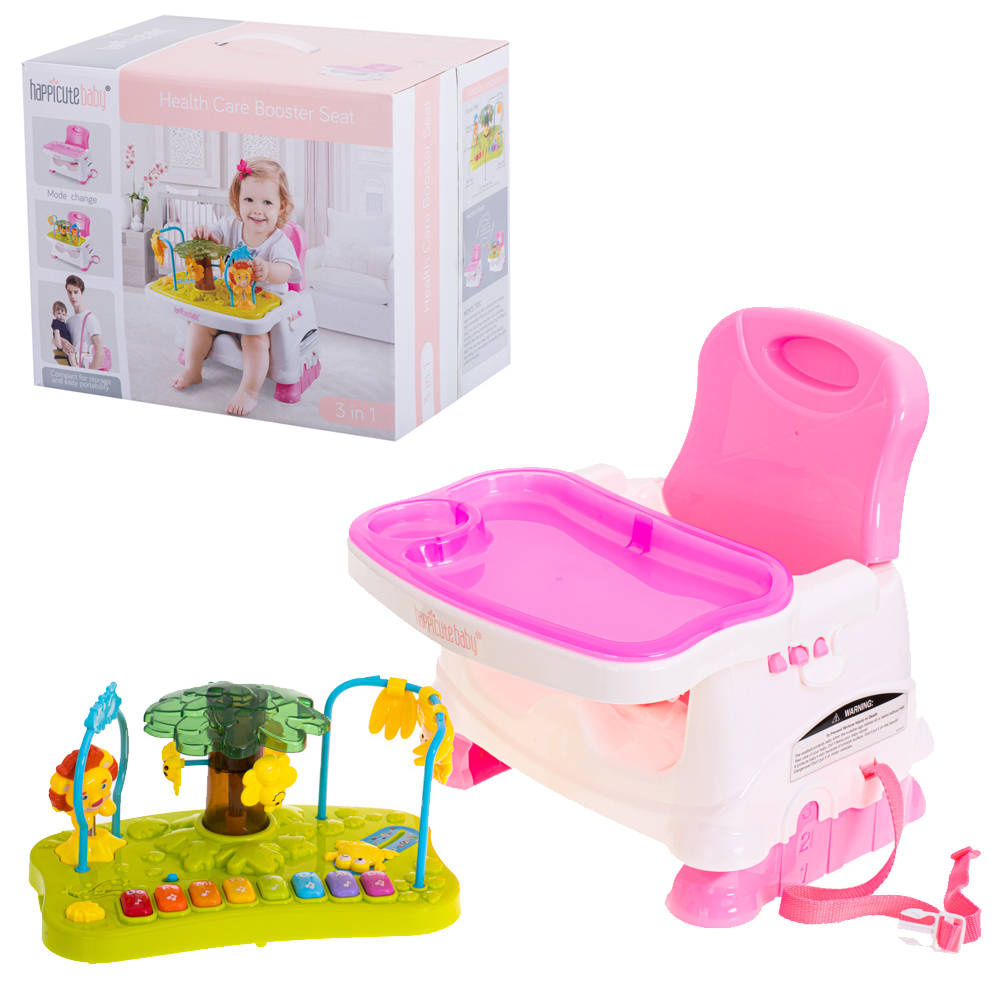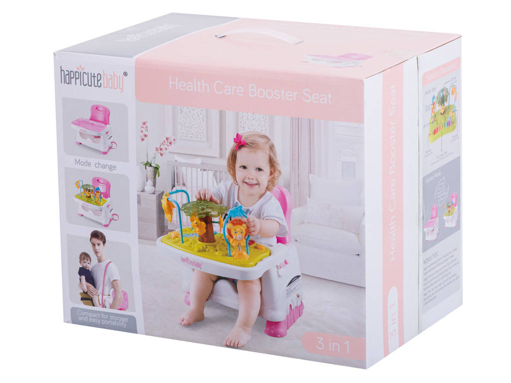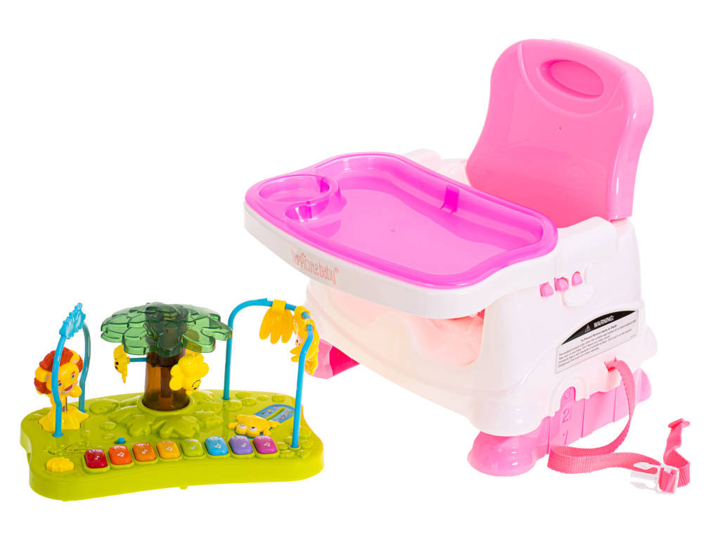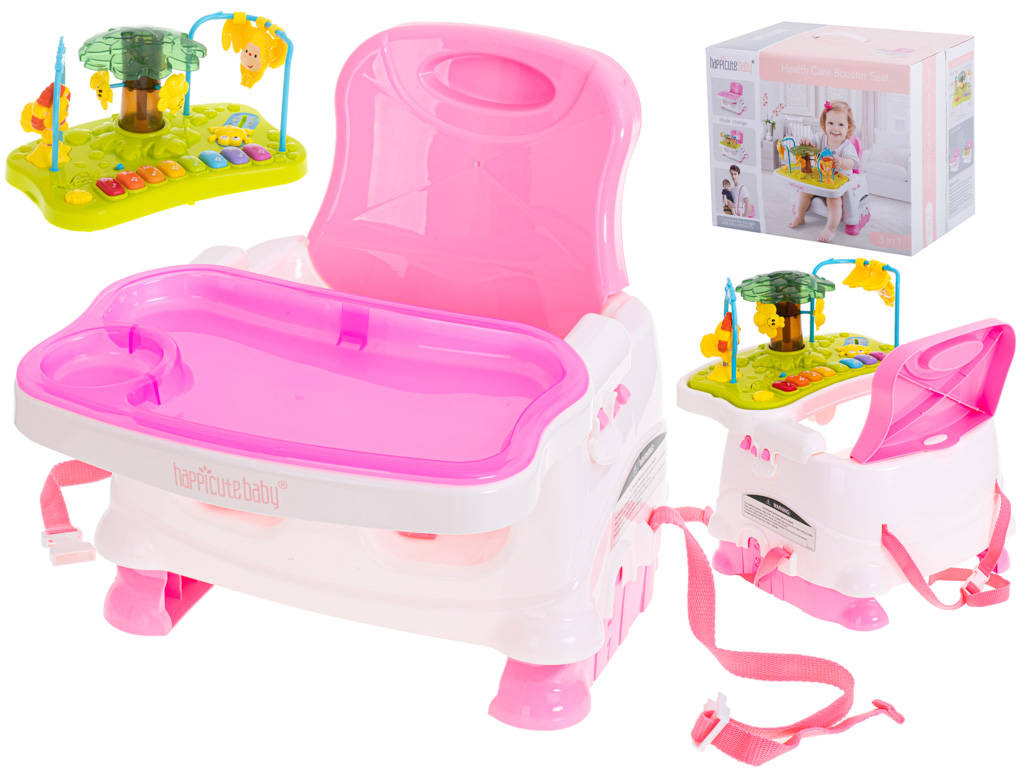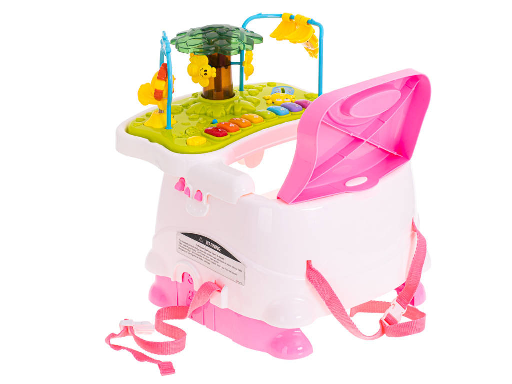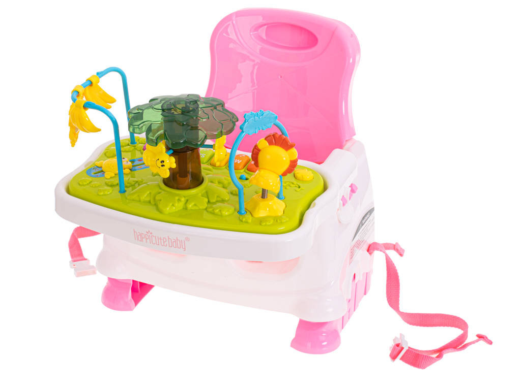 Wielofunkcyjny fotelik ze stolikiem do karmienia i nakładką do zabawy. Fotelik można postawić na ziemi lub przymocować do klasycznego stołka za pomocą specjalnych pasów. Drugi zestaw regulowanych pasów będzie gwarantował bezpieczeństwo dziecka przypiętego do fotelika. Z przodu można doczepić stolik do którego w komplecie otrzymujemy pasującą tacę na jedzenie.Druga dostępna nadstawka to interaktywna zabawka składająca się małpki na pałąku, lwa na sprężynce oraz obracającego się drzewka z pszczółkami. Dodatkowo nadstawka wyposażona jest w interaktywne pianinko działające w trzech trybach: zwykłe dźwięki pianina, odgłosy wydawane przez zwierzęta oraz przyjemne melodyjki wygrywane po naciśnięciu kolejnych klawiszy.