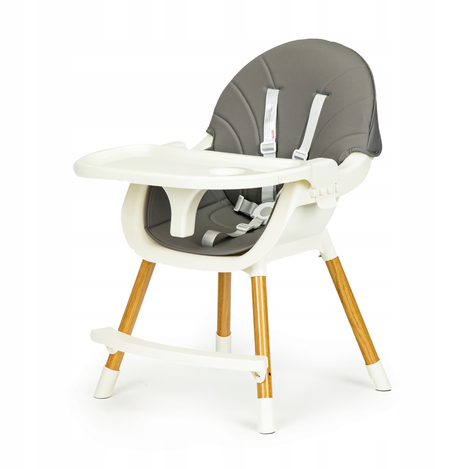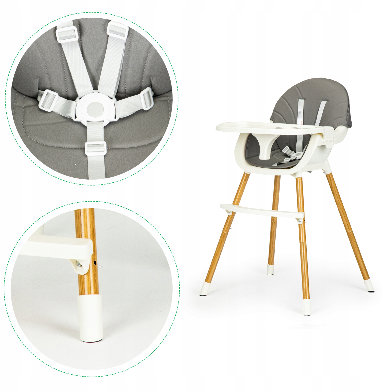 Wysokie, wygodne krzesełko do karmienia dzieci w kolorze szarym z drewnianymi elementami z możliwością przekształcenia na niższy fotelik. Krzesełko posiada 5 punktowe pasy bezpieczeństwa, które zapobiegają wypadnięciu dziecka z fotelika oraz specjalnie wyprofilowaną tackę, z której nic nie wyleje się na podłogę. Dodatkowe, antypoślizgowe stopki na nogach krzesełka zabezpieczają podłogę przed zarysowaniami.DANE TECHNICZNE: