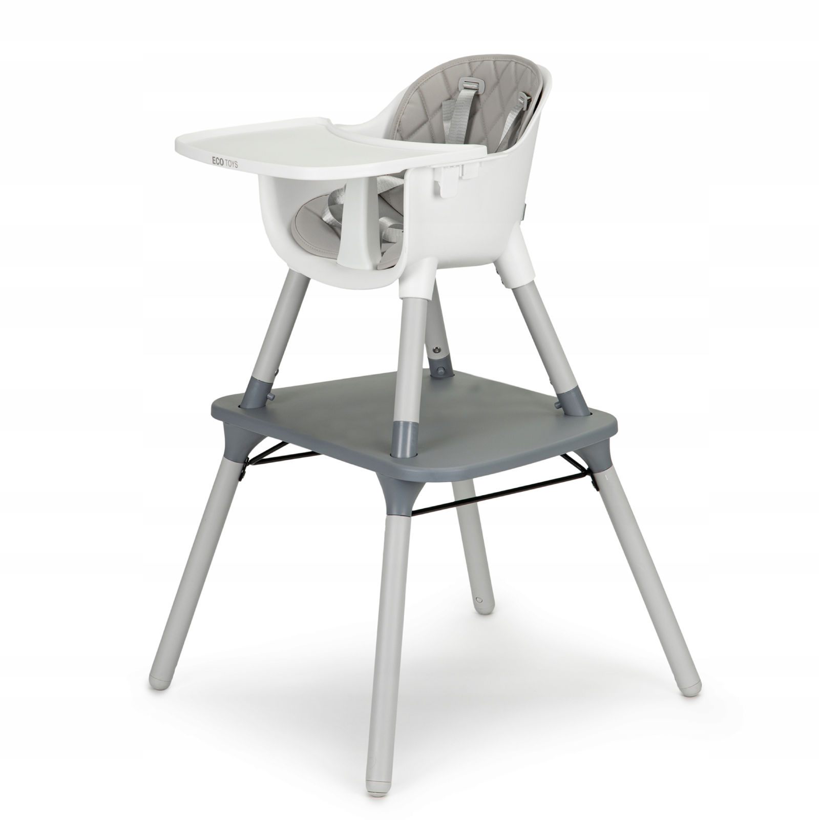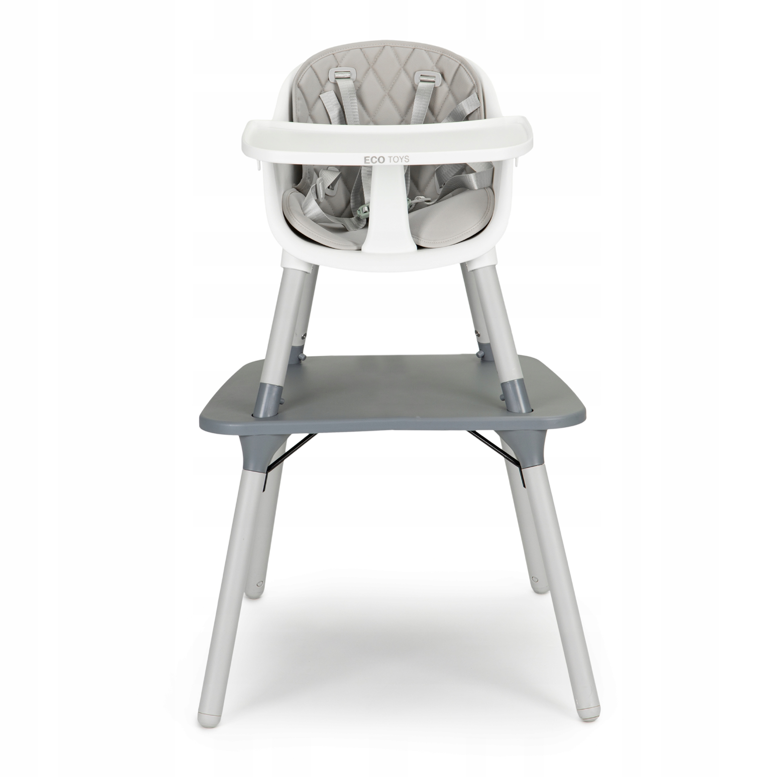 Wysokie, wygodne krzesełko do karmienia dzieci w kolorze szarym z mocną ramą i możliwością przekształcenia na niższy fotelik. Krzesełko posiada 5 punktowe pasy bezpieczeństwa, które zapobiegają wypadnięciu dziecka z fotelika oraz specjalnie wyprofilowaną tackę, z której nic nie wyleje się na podłogę. Dodatkowe, antypoślizgowe stopki na nogach krzesełka zabezpieczają podłogę przed zarysowaniami. W zestawie z krzesełkiem otrzymujecie również stoliczek, przy którym Twój maluch może rozwijać się motorycznie.DANE TECHNICZNE:
