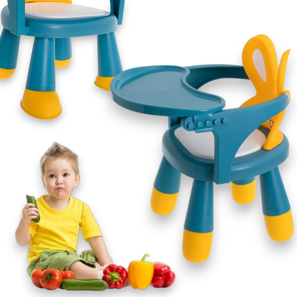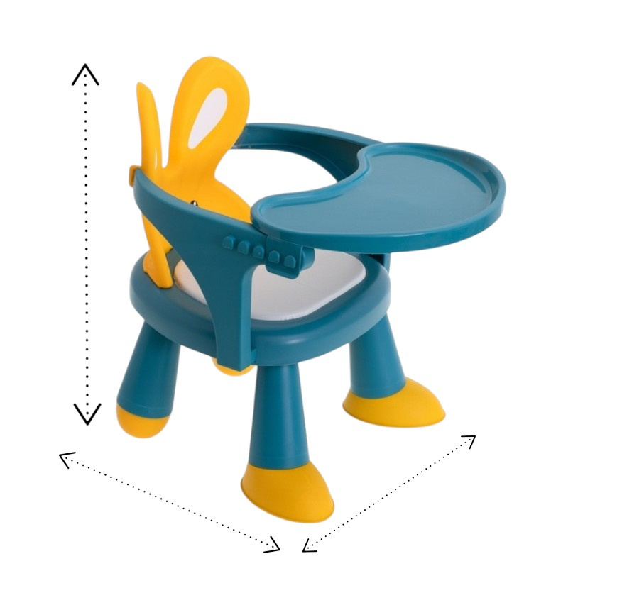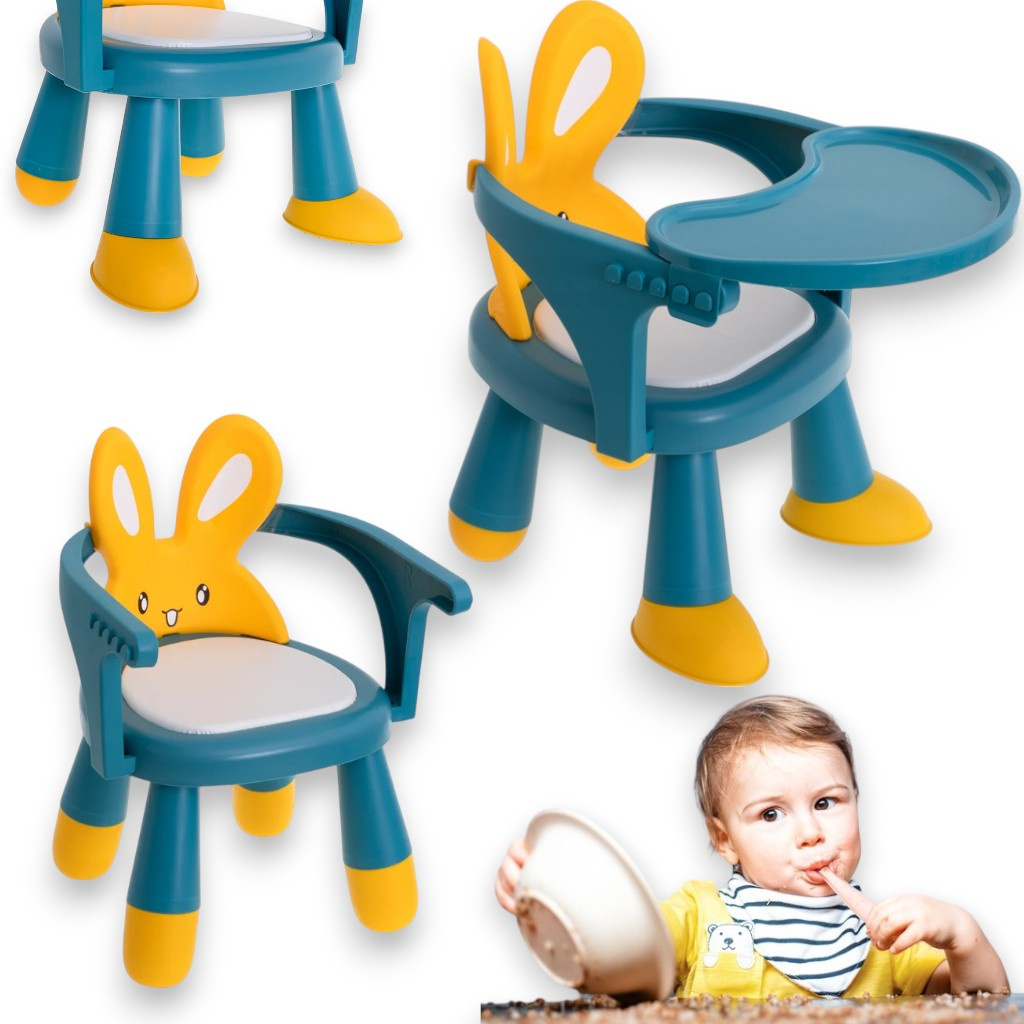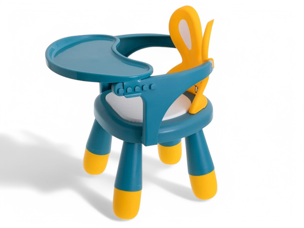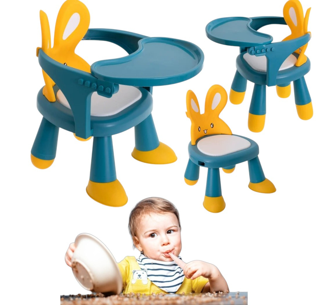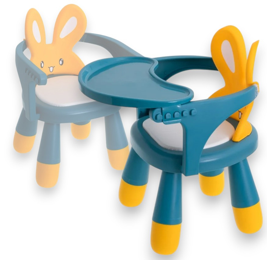 Wielofunkcyjne krzesełko ze stolikiem do karmienia i zabawy. Niezastąpiony przedmiot dla każdego małego dziecka. Jest łatwy i intuicyjny w złożeniu. Posiada możliwość odczepienia stolika oraz regulacji wysokości krzesła. Gdy dziecko urośnie wystarczy podmienić podstawki pod nóżki na wyższe. Swoją konstrukcją krzesełko do karmienia przedstawia uroczego, żółtego króliczka, który zachęci malucha do spędzenia na nim czasu.STOLIK DO ZABAWY DLA DZIECI