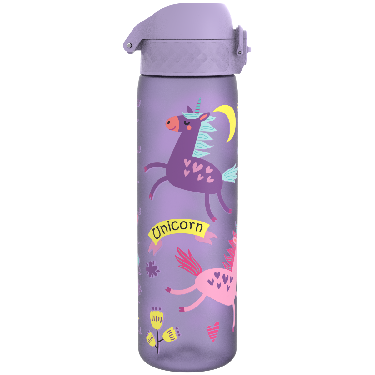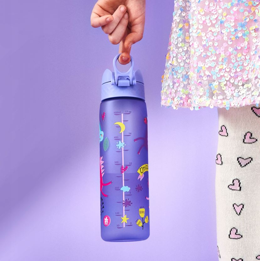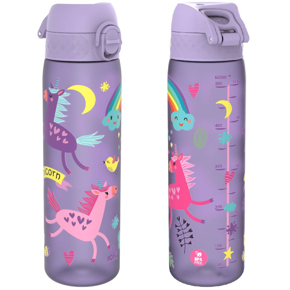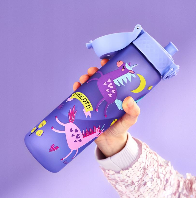 - Butelka na wodę dla dzieci w kolorze fioletowym z motywem jednorożca i tęczy, idealna do szkoły, na wycieczkę lub spacer. Materiał bezpieczny w użytkowaniu BPA FREE. Ceniona marka ION8. Pojemność 500 ml.