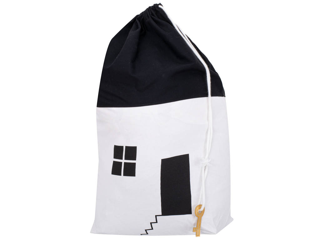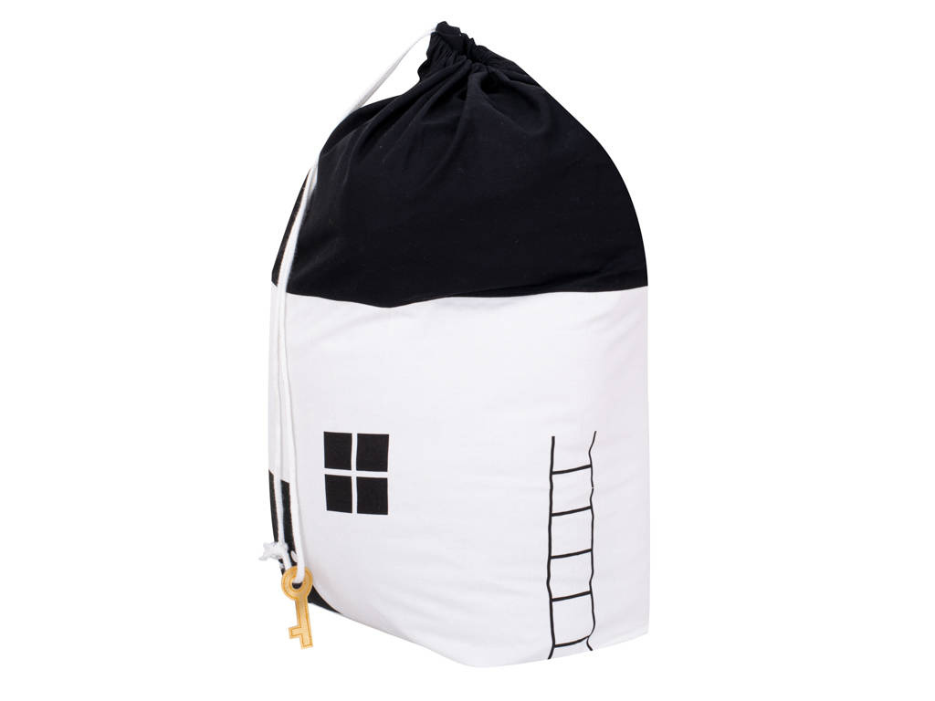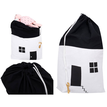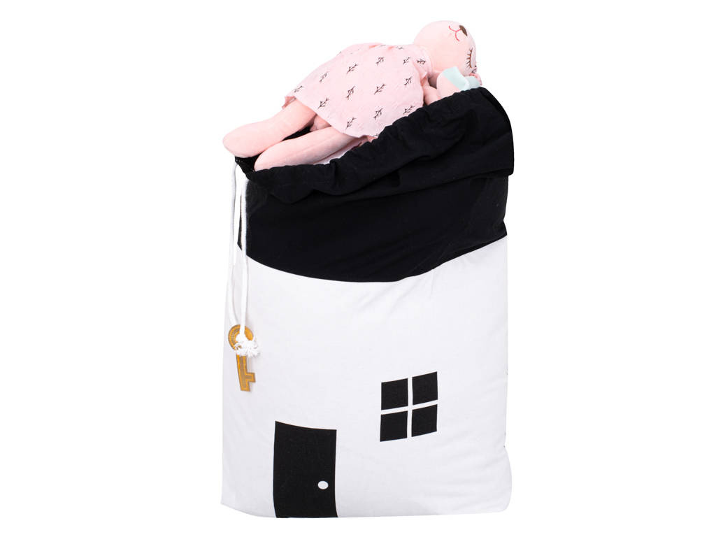 Nowoczesny design do Twojego domu. Czarno biały pojemnik-worek do przechowywania. Zapanuj nad otaczającym Cię bałaganem! Świetnie sprawdzi się jako element dziecinnego pokoju. Możesz do niego szybko posprzątać samochodziki, pluszaki lub klocki. Dzięki niemu dziecku łatwiej będzie zapanować nad swoimi kolekcjami zabawek. Zastosowanie kilu worków pozwoli na ćwiczenia z segregacji.UNIWERSALNY POJEMNIK CZARNO-BIAŁY DOMEK