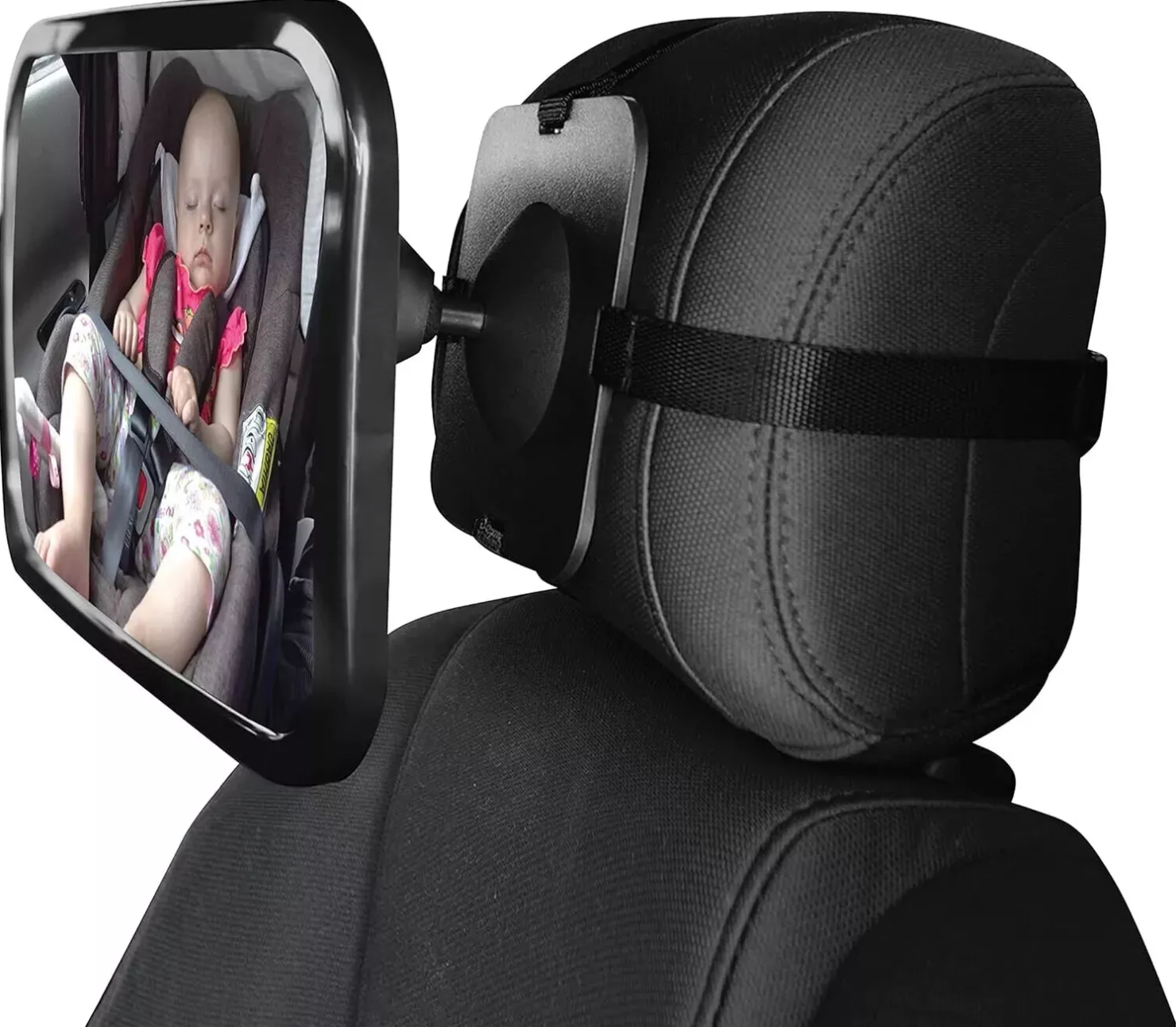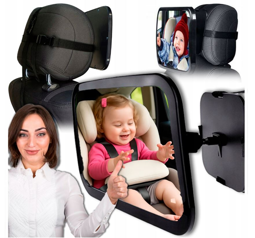 - Bezpieczne lusterko do obserwacji dziecka w samochodzie podczas podróży. Wygodne rozwiązanie dla rodziców podróżujących z dziećmi samochodami. Mocowane za pomocą pasków, obrót o 360 stopni.