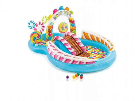 Najsłodszy cukierkowy plac zabaw jaki może stanąć w Twoim ogródku. Dzieciaki będą nim zachwycone ! Zestaw składa sie z baseniku, zjeżdżalni z miękką poduszką do lądowania i brodzika z niższą wodą.Po obu stronach brodzika biegną ścianki z torami dla piłeczek. Zróbcie zawody czyja piłeczka szybciej wpadnie do basenu. Możecie też ćwiczyć celność rzucając piłeczkami w obręcze nad basenem.