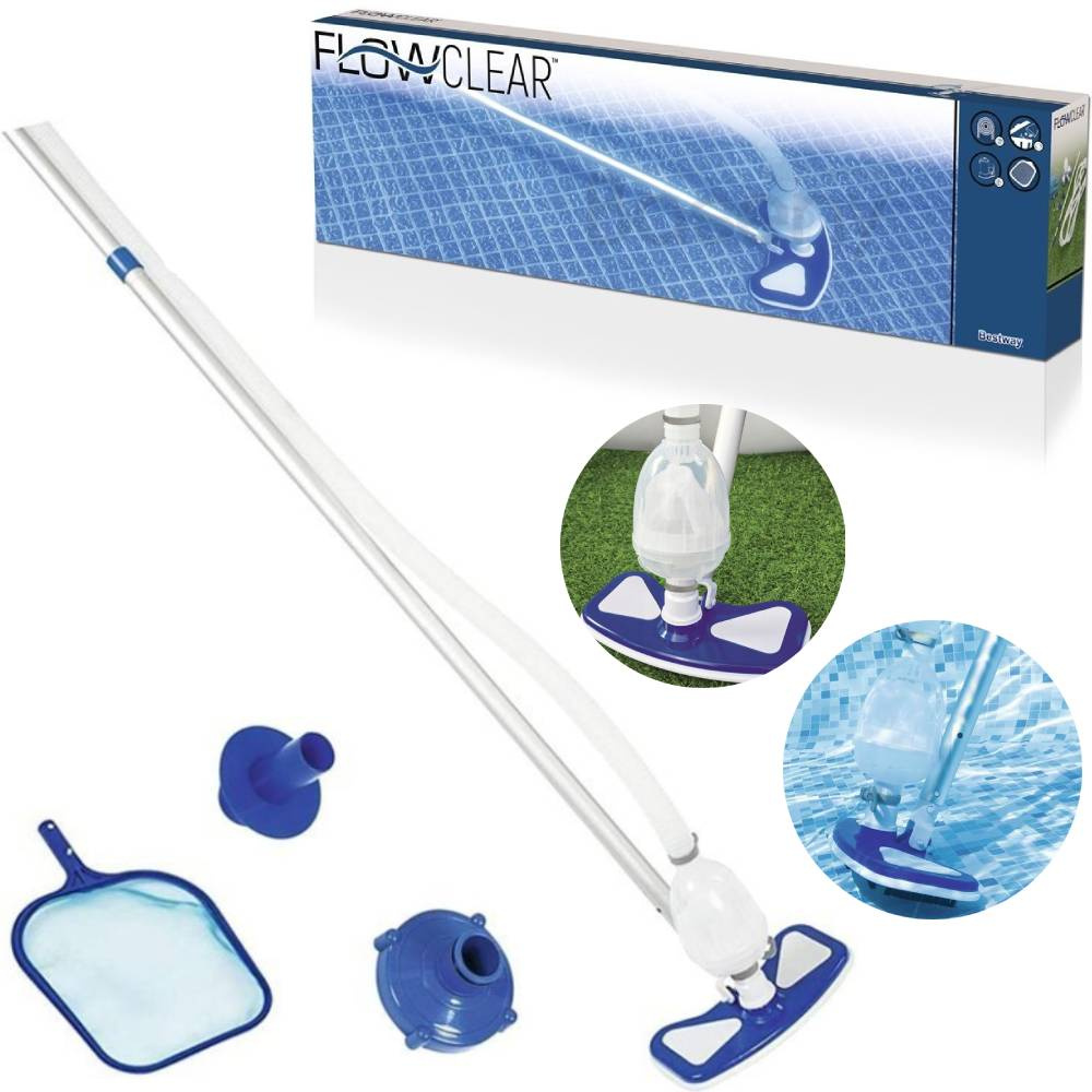 W zestawie znajduje się również odkurzacz do mycia dla basenu, ze specjalną końcówką. Po podłączeniu do pompy skutecznie usunie zabrudzenia z basenu. Do prawidłowego działania potrzebna jest pompa o mocy 2006l/h. Dzięki temu zestawowi do czyszczenia łatwiej będzie zadbać o odpowiedniej jakości wodę w basenie przez cały sezon. Przedmioty zostały wykonane z wysokiej jakości materiałów, przez popularną wśród akcesoriów do basenów firmę – Bestway.DANE TECHNICZNE