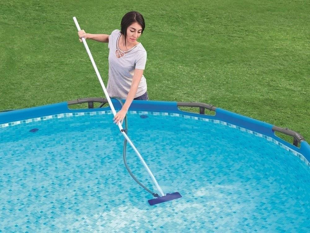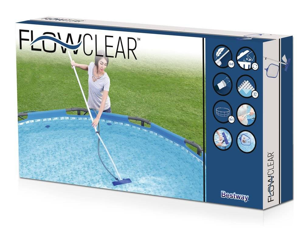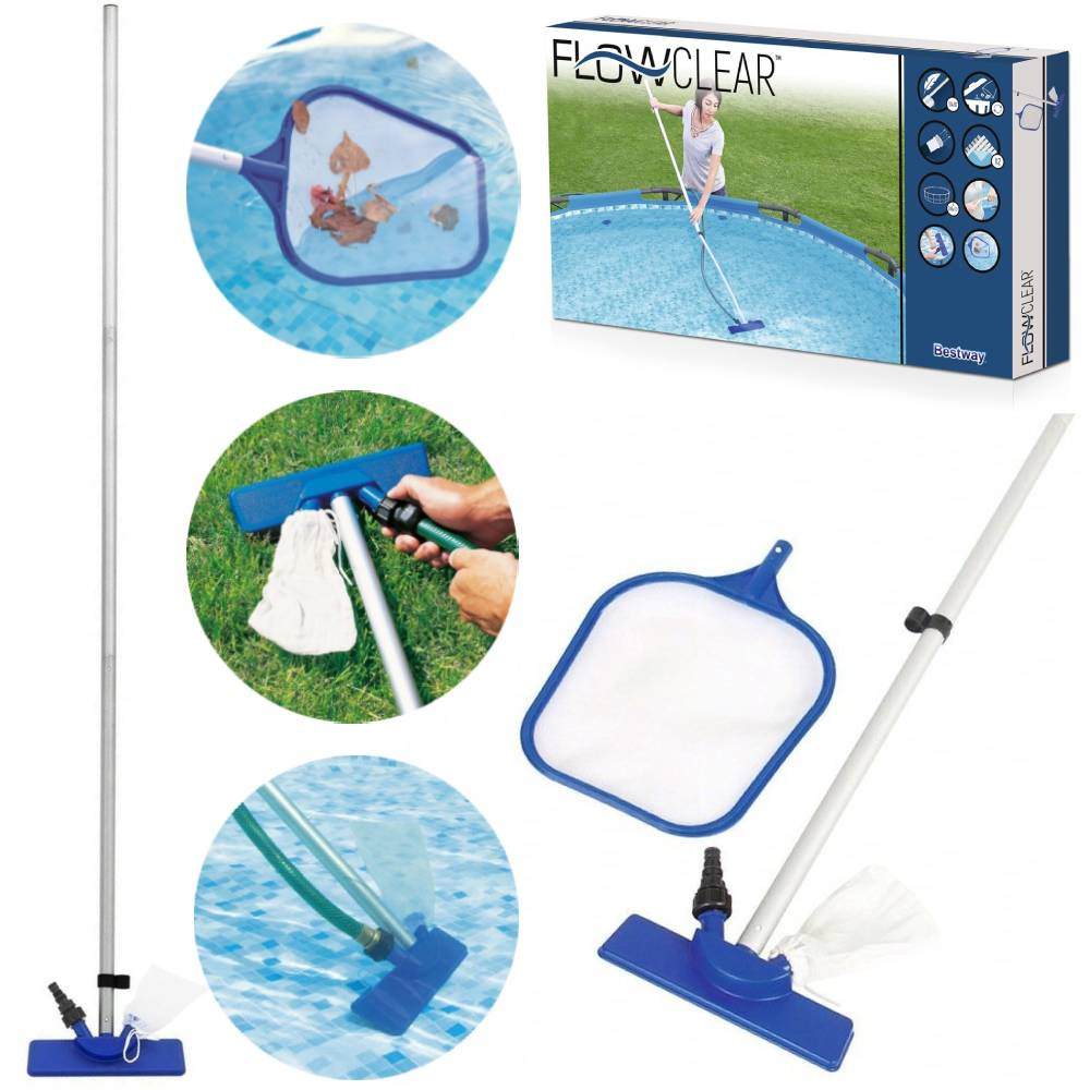 W zestawie znajduje się również odkurzacz do mycia dla basenu, ze specjalną końcówką. Po podłączeniu do węża ogrodowego zanieczyszczenia są kierowane do specjalnego woreczka. Kij znajdujący się w zestawie pasuje zarówno do odkurzacza, jak i do siatki. Dzięki temu zestawowi do czyszczenia łatwiej będzie zadbać o odpowiedniej jakości wodę w basenie przez cały sezon. Przedmioty zostały wykonane z wysokiej jakości materiałów, przez popularną wśród akcesoriów do basenów firmę – Bestway.DANE TECHNICZNE