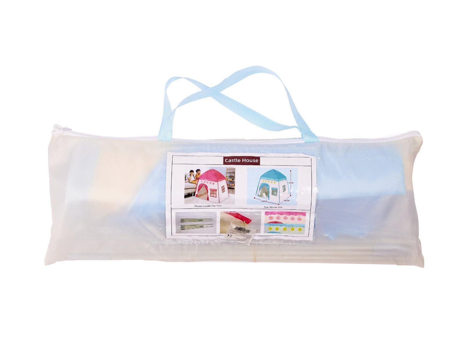 Namiot wykonano z lekkiego materiału, nie odpornego na wodę. Stelaż jest wykonany z rurek z tworzywa dzięki temu całość jest lekka i wytrzymała. Składanie i rozkładanie namioty nie sprawia żadnych trudności. Domek można łatwo przenosić bez konieczności składania go. Do zestawu załączono praktyczną torbę pozwalająca na przechowanie złożonego namiotu po zabawie oraz przewożenie gdy chcemy go zabrać na wakacyjny wyjazd.Dostępny jest również domek w kolorze różowym.