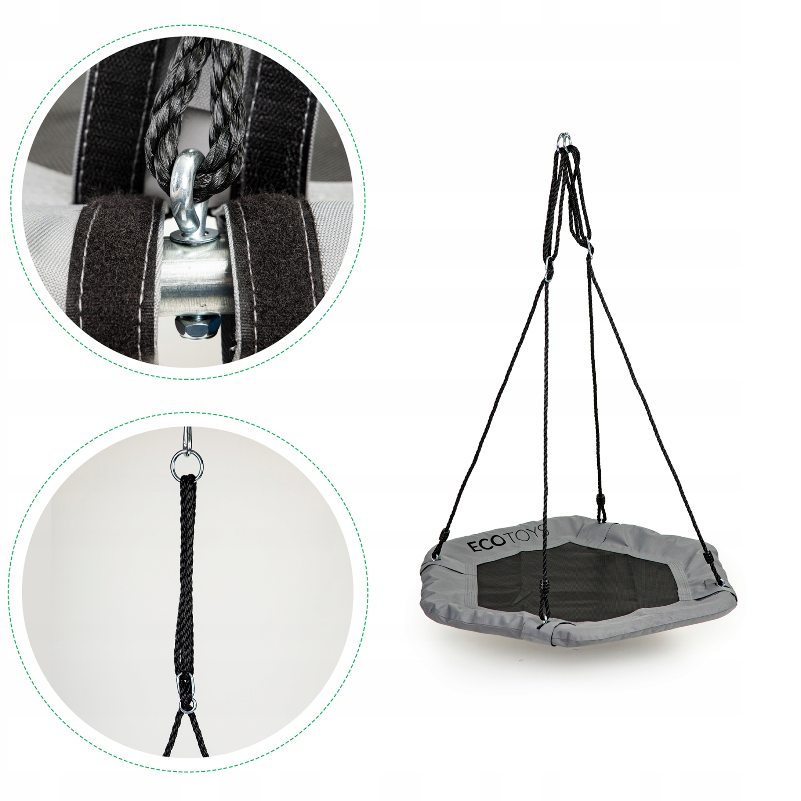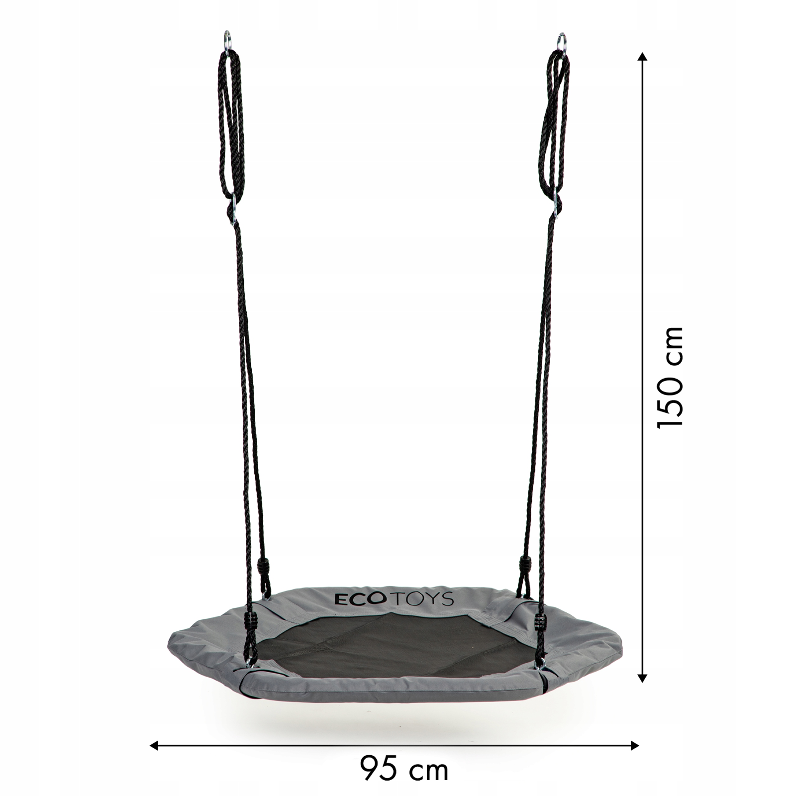 Szara huśtawka ogrodowa „bocianie gniazdo” dla dzieci o sześciokątnym kształcie, idealnie sprawdzi się w przydomowym ogródku lub na placu zabaw. Huśtawka posiada regulowane, grube liny z maksymalnym zawieszeniem do 150 cm oraz wygodne, piankowe siedzisko o średnicy 95 cm. Dzięki regulacji wysokości, możesz bez problemu dostosować ją do wzrostu swojego dziecka. Bocianie gniazdo zapewni Twoim maluchom mnóstwo frajdy na świeżym powietrzu!DANE TECHNICZNE: