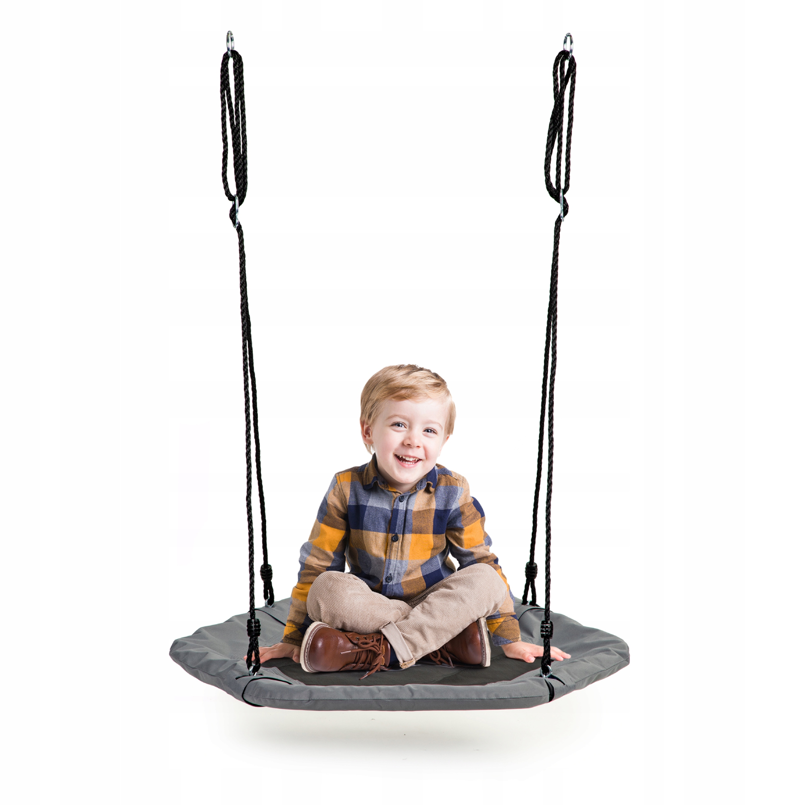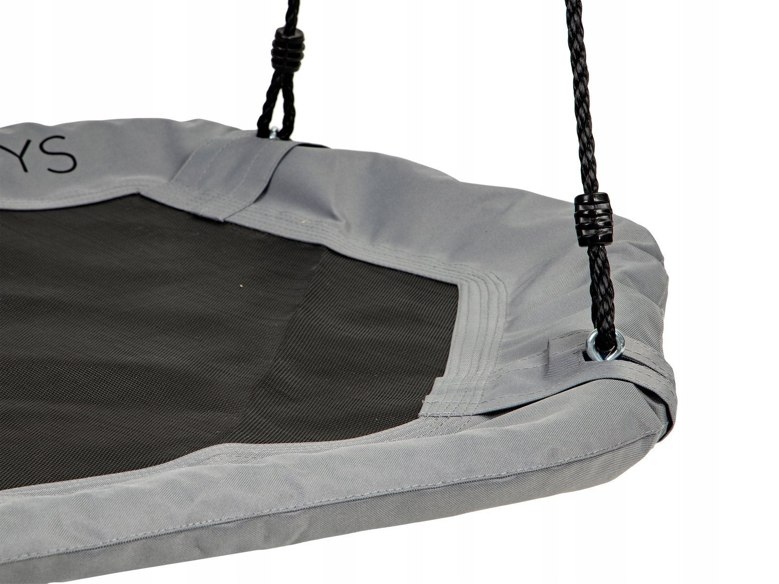- Szara huśtawka ogrodowa dla dzieci o średnicy 95 cm zapewni świetną zabawę na świeżym powietrzu. Dzięki regulowanym linkom, dostosujesz ją do wzrostu swojego dziecka. Do użytku od lat 3.