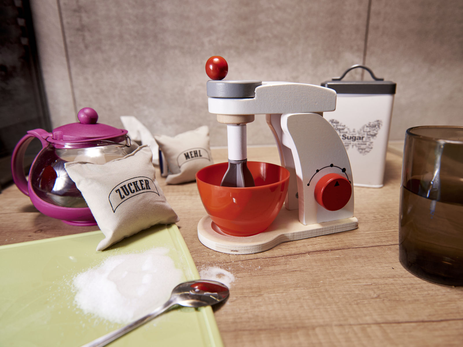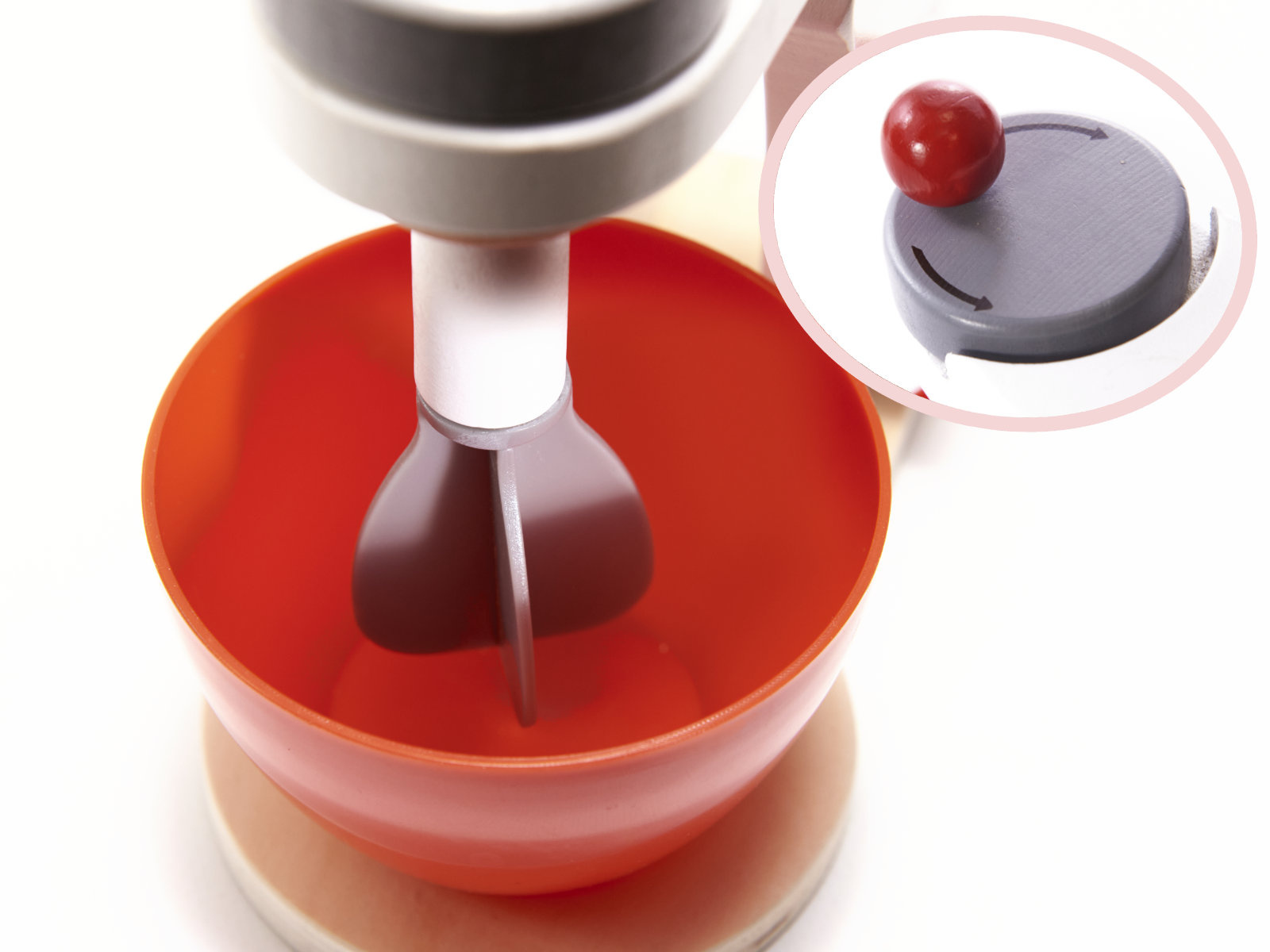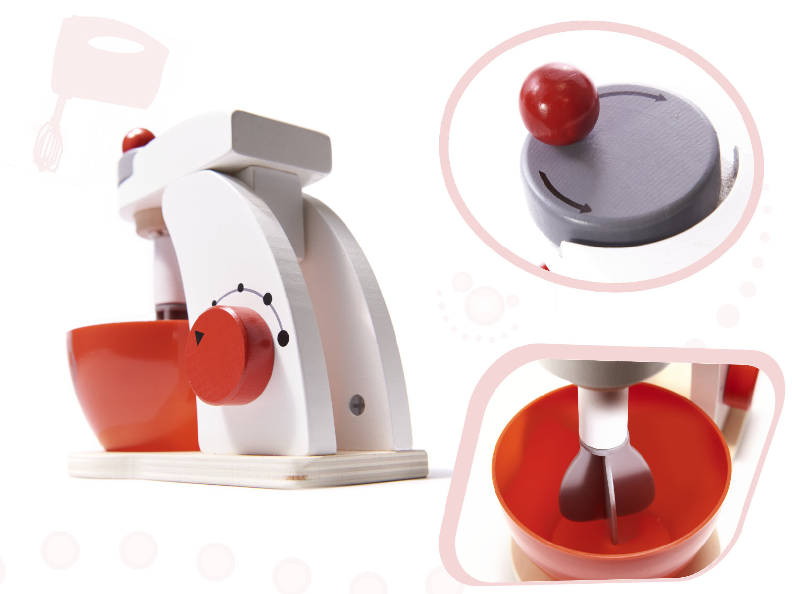 • Drewniany, starannie wykonany mikser z ruchomymi elementami dla dzieci