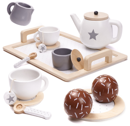 Dbaj o prawidłowy rozwój swojego dziecka i podaruj mu zestaw, z którym rozwinie swoją wyobraźnię. Piękny, drewniany serwis kawowy z zestawem filiżanek, dzbankiem, cukierniczką, sztućcami oraz tacą będzie świetnym prezentem dla dzieci, które uwielbiają organizować przyjęcia dla swoich maskotek. Wszystkie elementy zostały wykonane ze szczególną starannością, a ich drewniana forma sprawi, że będzie się można nimi bawić bezpiecznie. Więc niech Twoja pociecha zaprasza swoje misie i pozostałe maskotki na pyszną herbatkę – z takim zestawem, będzie na pewno lepiej smakować!SKŁAD ZESTAWU: