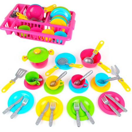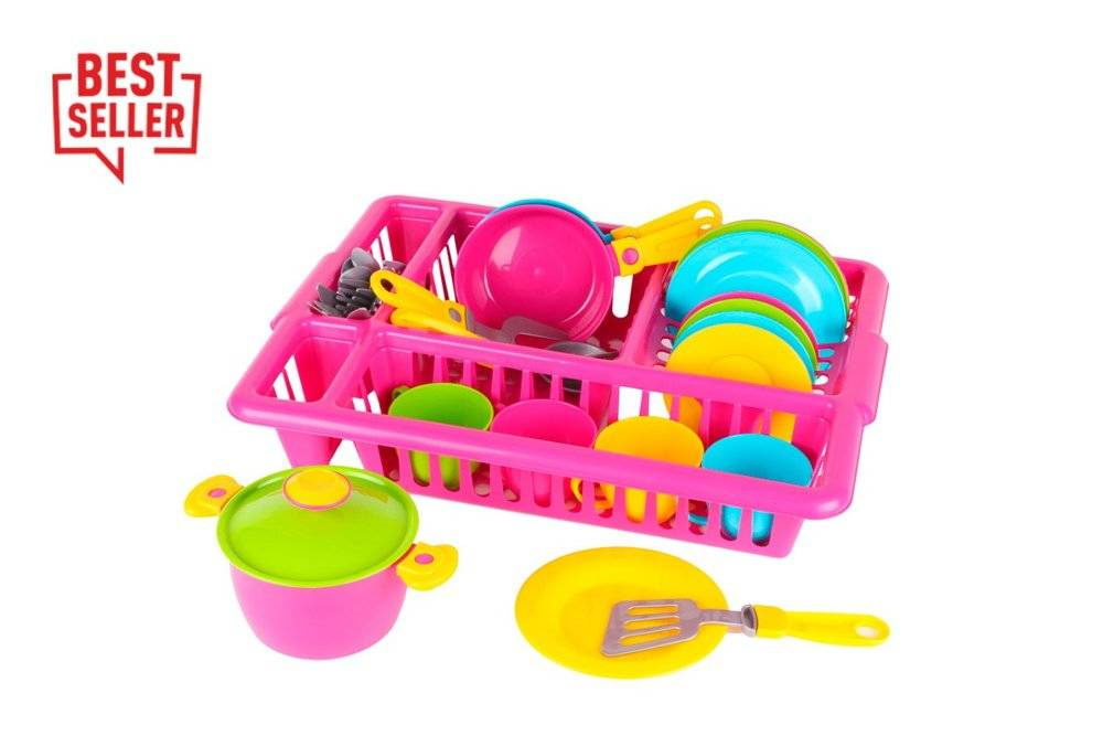 Wspaniały zestaw akcesoriów kuchennych dla prawdziwego małego kucharza. Rozwiń pasję do gotowania Twojego dziecka od najmłodszych lat, a już niedługo w kuchni mogą pojawić się dodatkowe ręce do pracy. Zabawa w dom jest jedną z ulubionych przez dzieci, ponieważ mogą one naśladować swoich rodziców. W zestawie znajdują się różne garnki, naczynia oraz suszarka do naczyń , które będą przydatne podczas zabawy w kuchnie lub przyjęcie. Wszystkie elementy zestawu kuchennego zostały wykonane z bezpiecznych materiałów oraz nie posiadają ostrych krawędzi.ZABAWKOWE NACZYNIA I GARNKI Z SUSZARKĄ DO NACZYŃ