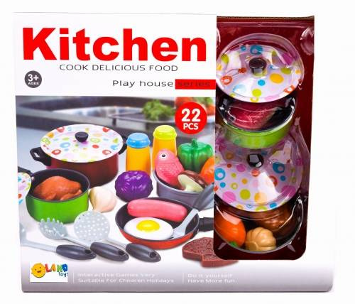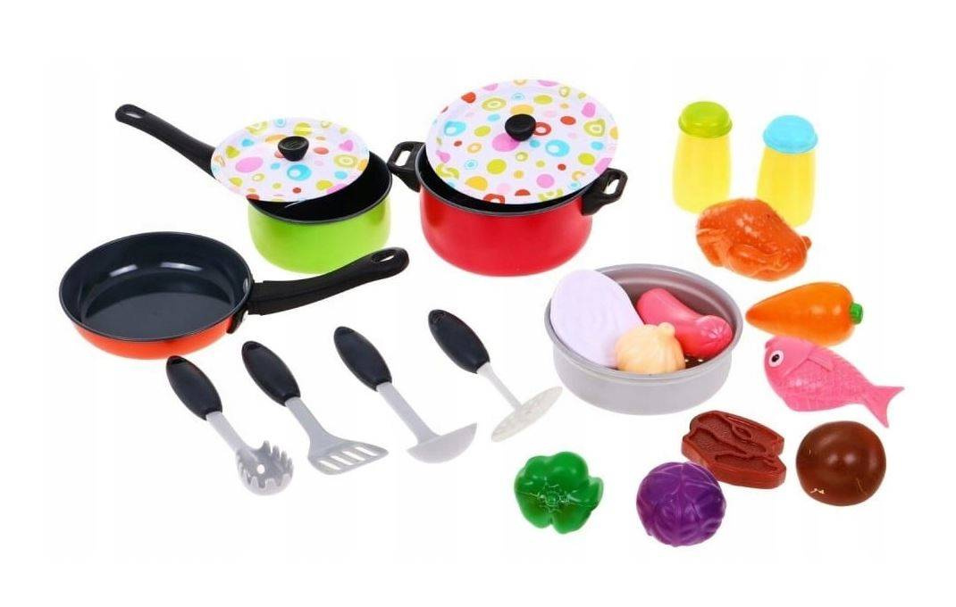Wspaniały zestaw akcesoriów kuchennych dla prawdziwego małego kucharza. Rozwiń pasję do gotowania Twojego dziecka od najmłodszych lat, a już niedługo w kuchni mogą pojawić się dodatkowe ręce do pracy. Zabawa w dom jest jedną z ulubionych przez dzieci, ponieważ mogą one naśladować swoich rodziców. W zestawie znajdują się różne garnki, patelnie oraz przybory kuchenne. Wszystkie elementy zestawu będą przydatne podczas zabawy w gotowanie. Zabawki zostały wykonane z wysokiej jakości materiałów, posiadają żywe kolory które z pewnością przyciągną uwagę dziecka.ZABAWKOWE GARNKI AKCESORIA JEDZENIE