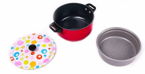 - Duży zestaw, który urozmaici zabawę w kuchnie. Posiada żywą kolorystykę która zachęci do zabawy. W zestawie wiele naczyń do gotowania, ale również zabawkowe jedzenie. Dla dzieci powyżej 3 roku życia.