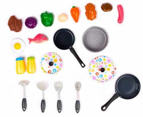 Pomóż swoim dzieciom urozmaicić zabawę dzięki zestawowi garnków oraz produktów spożywczych. Niech poczują się jak prawdziwi kucharze, używając przedmiotów odwzorowanych na te używane przez profesjonalistów. Dziecięca kuchnia może wzbogacić się m.in. o patelnie, garnki oraz zabawkowe jedzenie. Produkty spożywcze, które znajdziemy w zestawie urozmaicą zabawę, są to m.in.: jajko, stek oraz ryba. To jakie danie zostanie przyrządzone zależy tylko od wyobraźni i kreatywności dziecka. Podaruj mu wspaniały zestaw kuchenny, który z pewnością znajdzie swoje miejsce w dziecięcej kuchni.DANE TECHNICZNE