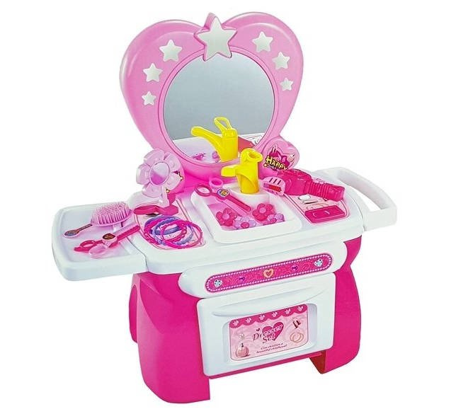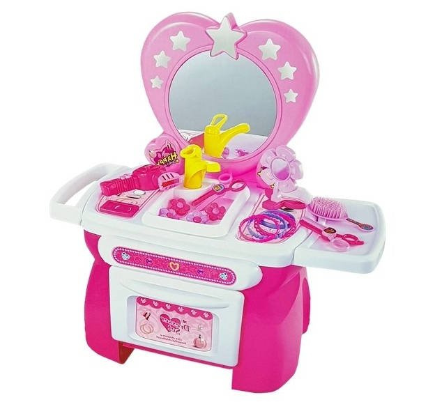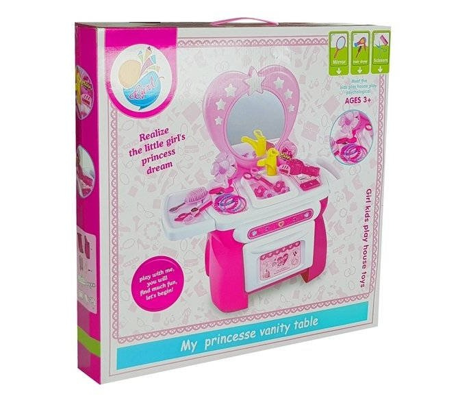 Własna toaletka to doskonała propozycja dla każdej małej damy i niezbędny element w jej pokoju. Niech poczuje się jak księżniczka. Zabawka posiada lustro, w którym Twoja mała pociecha może się przeglądać w trakcie robienia się na bóstwo. Na blacie znajduje się m.in. suszarka i masa akcesoriów imitujących prawdziwe przybory stosowane w salonie urody. Z takim ekwipunkiem, Twoja pociecha może szykować się na bal i wyglądać wystrzałowo!W ZESTAWIE: