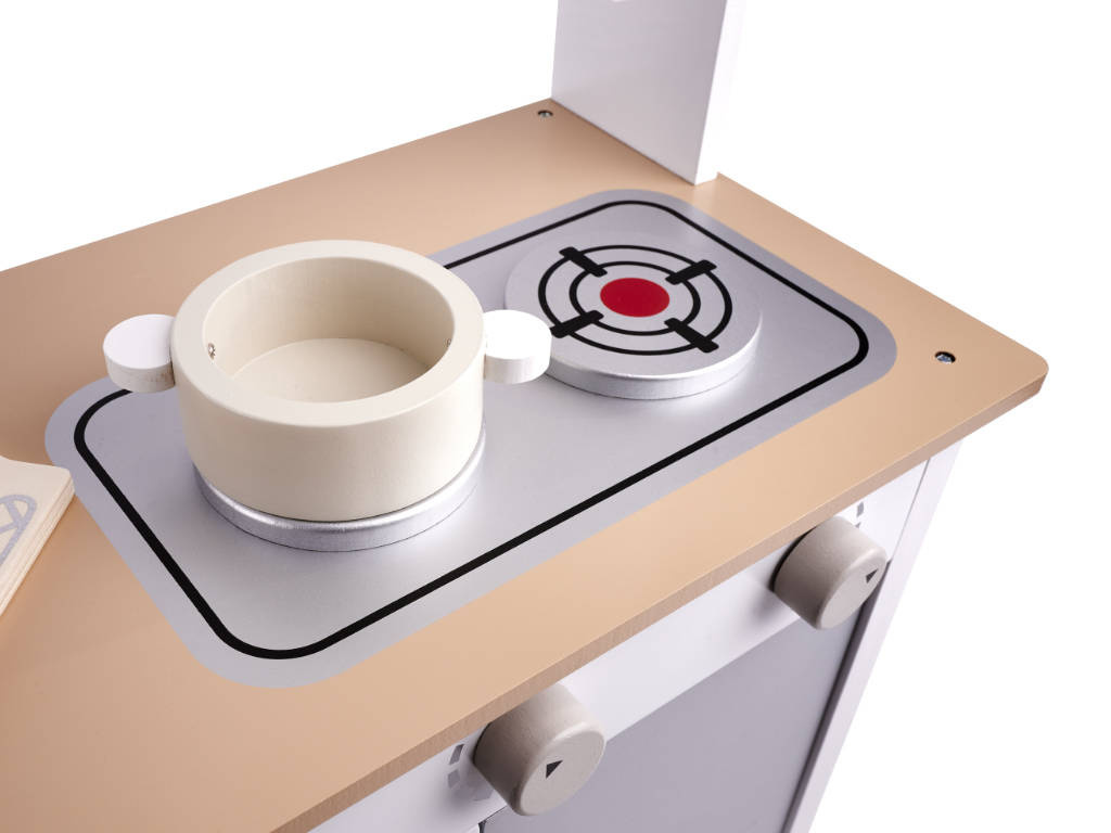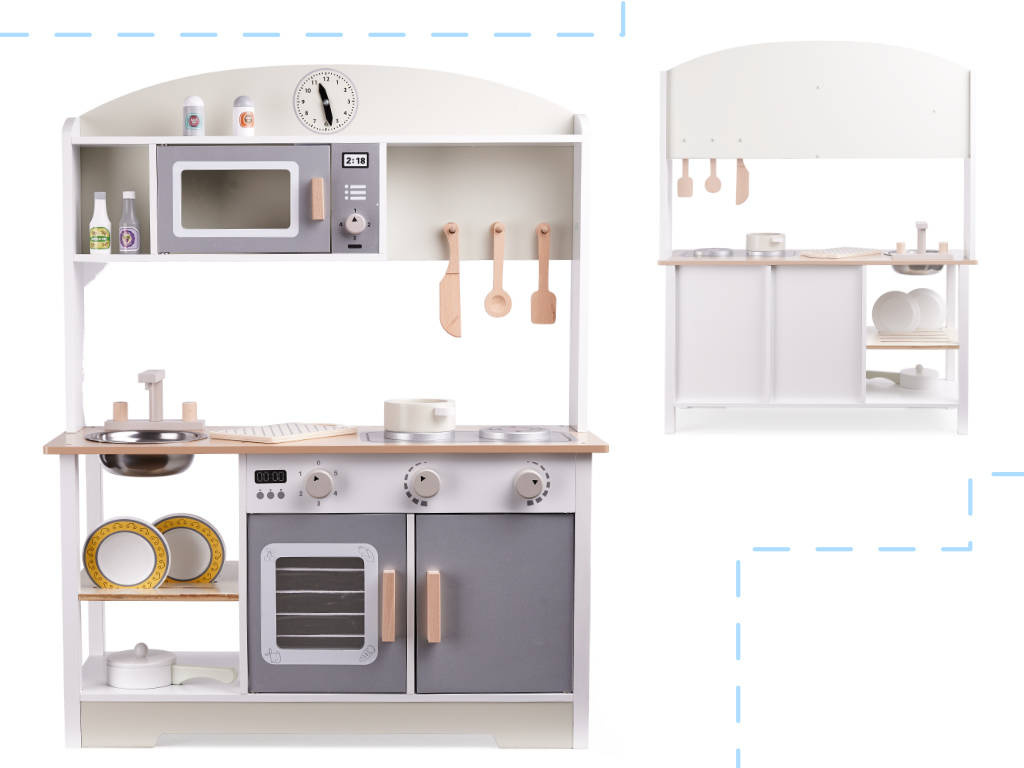 Kuchnia wykonana jest w większej części z drewna. Zapewnia to dużą trwałość i funkcjonalność zabawki. W zestawie znajdują się również elementy, które zazwyczaj znajdują się w kuchni. Są to m.in. sztućce, talerze, garnek, butelki przyprawowe i deska do krojenia.Świetna zabawa, która pozwoli rozwijać wyobraźnię, kreatywność i zdolności manualne małego dziecka. Obsługa zabawkowej kuchni takich samych elementów jak w kuchni prawdziwej, bez ryzyka poparzenia czy też innych urazów na pewno zaprocentuje na przyszłość.