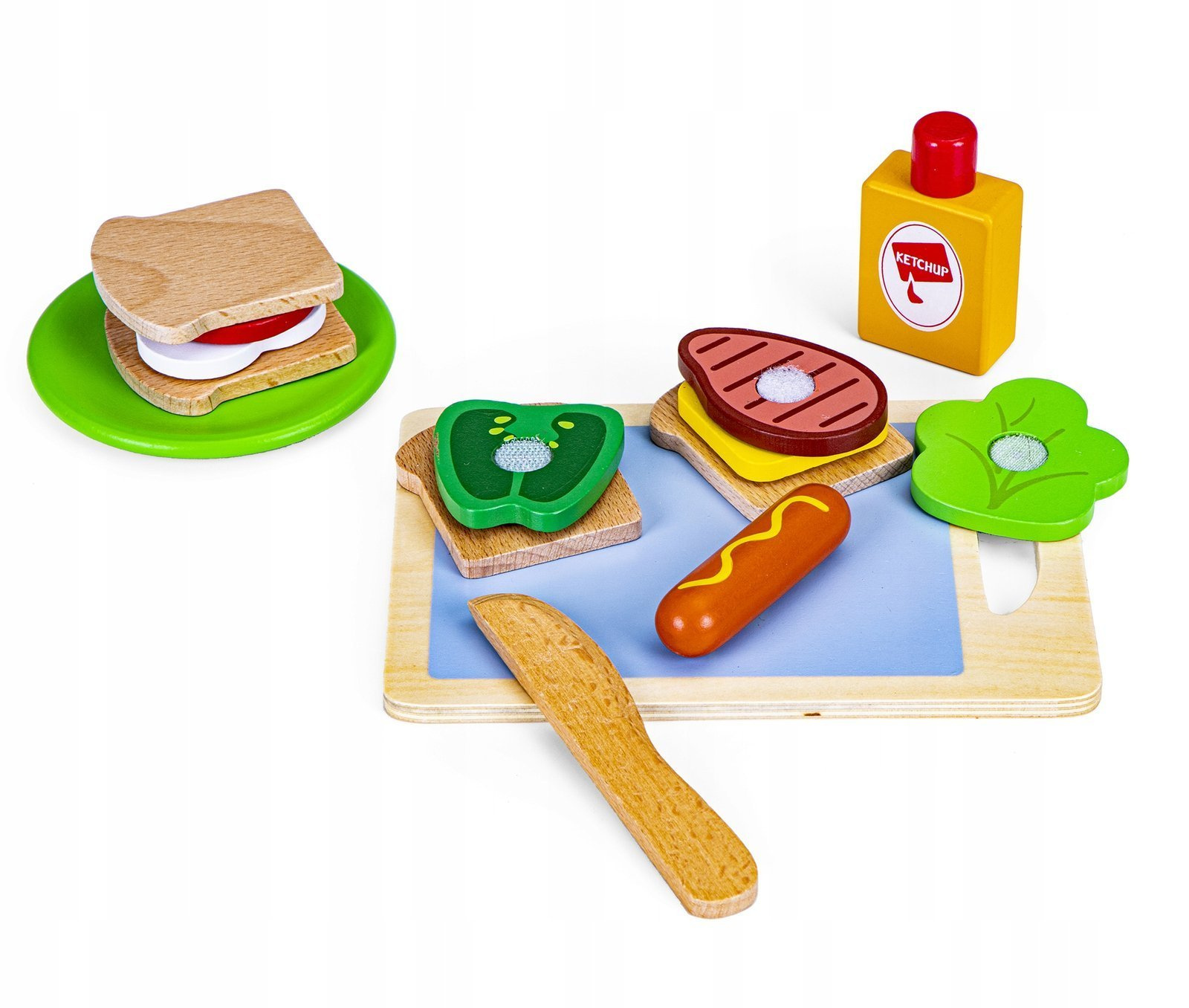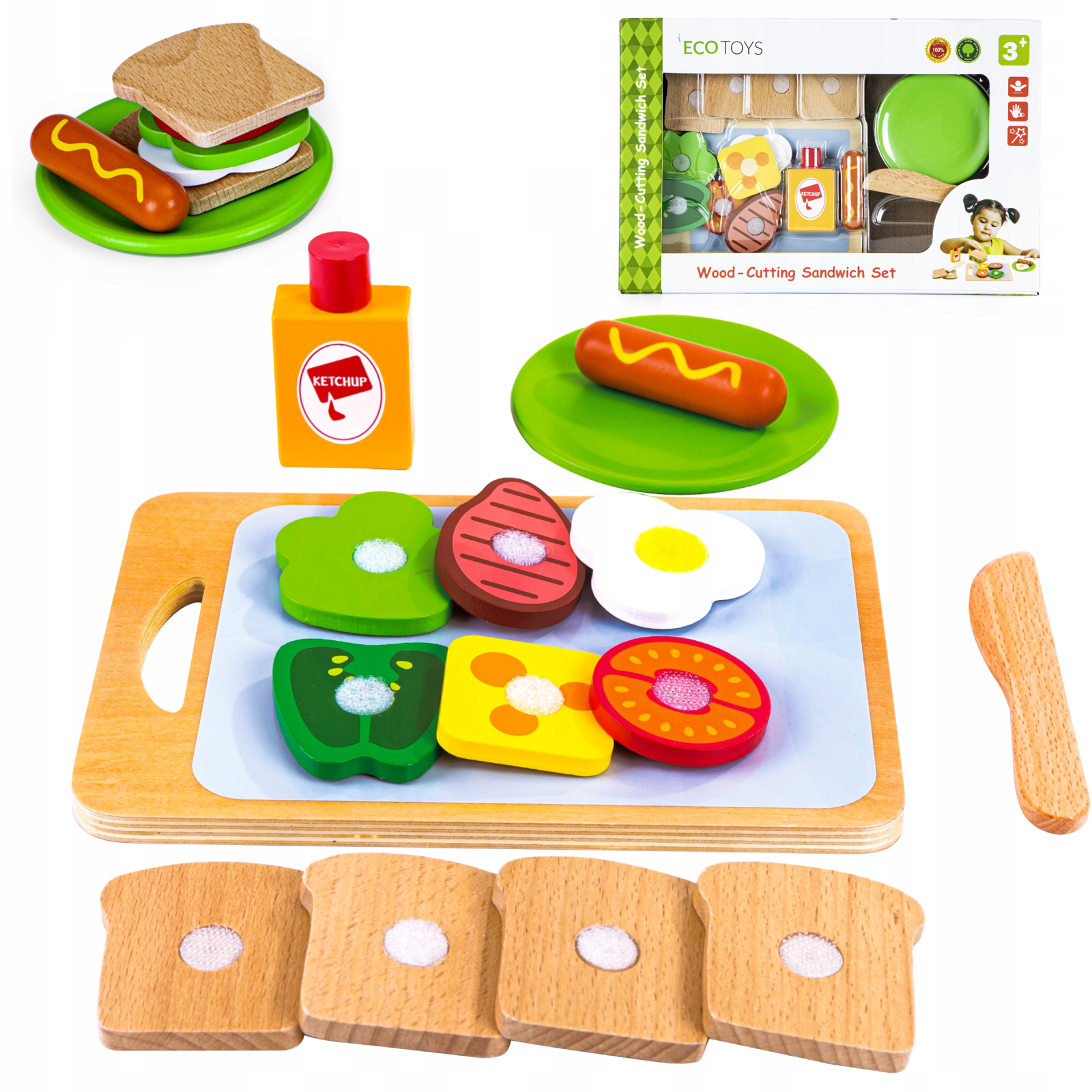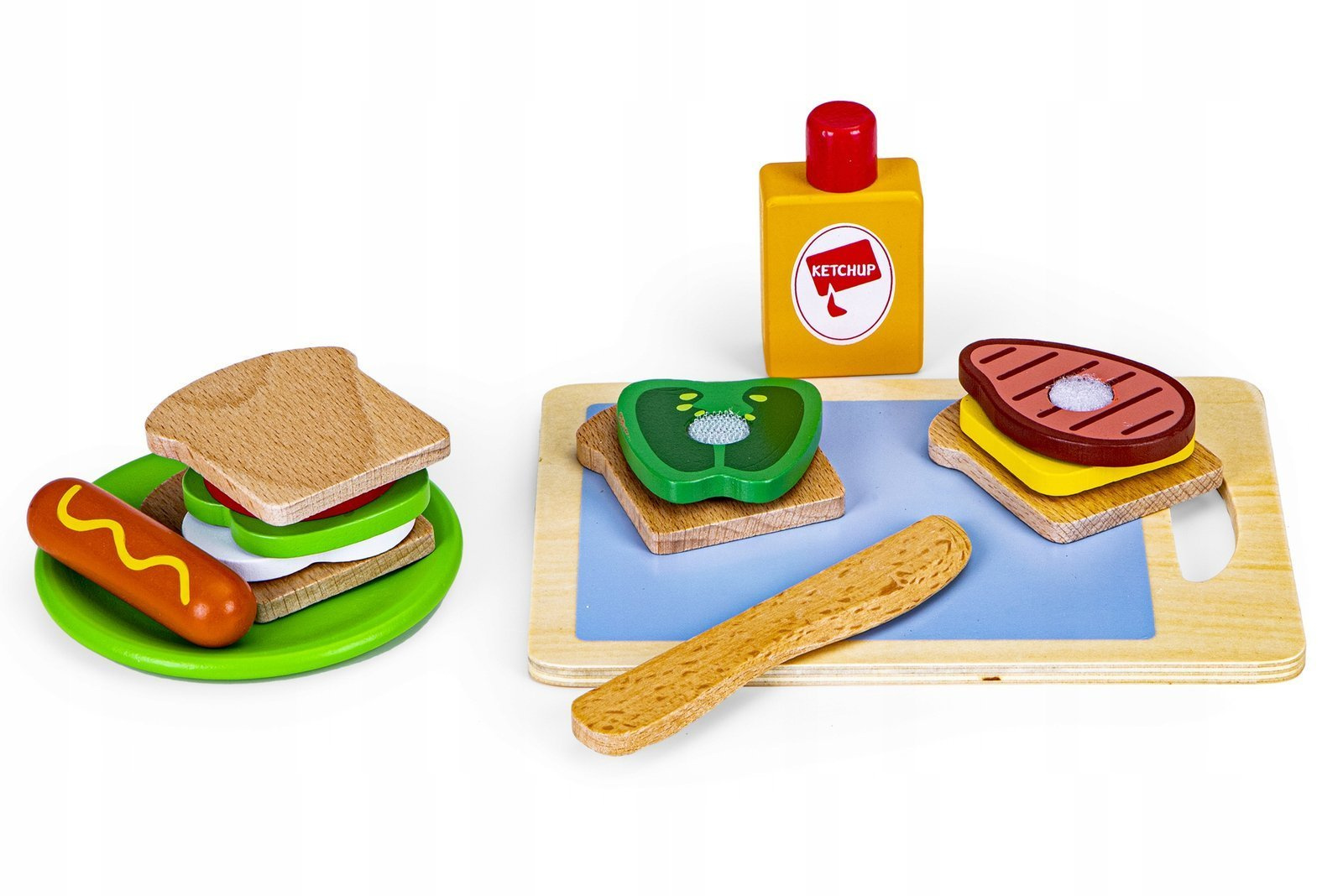 - Zestaw drewnianych akcesoriów do budowania kanapki z deseczką i nożem dla dzieci. Zabawka wspiera prawidłowy rozwój Twojego dziecka oraz pobudza jego wyobraźnię. Dla dzieci od lat 3.