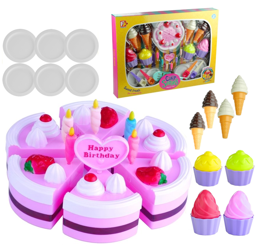 - Duży zestaw słodkości z tortem składający się z 30 elementów będzie idealnym uzupełnieniem podczas przyjęcia na cześć Waszego malucha. Zabawka jest bezpieczna a do tego rozwija wyobraźnię i zdolności manualne dziecka.