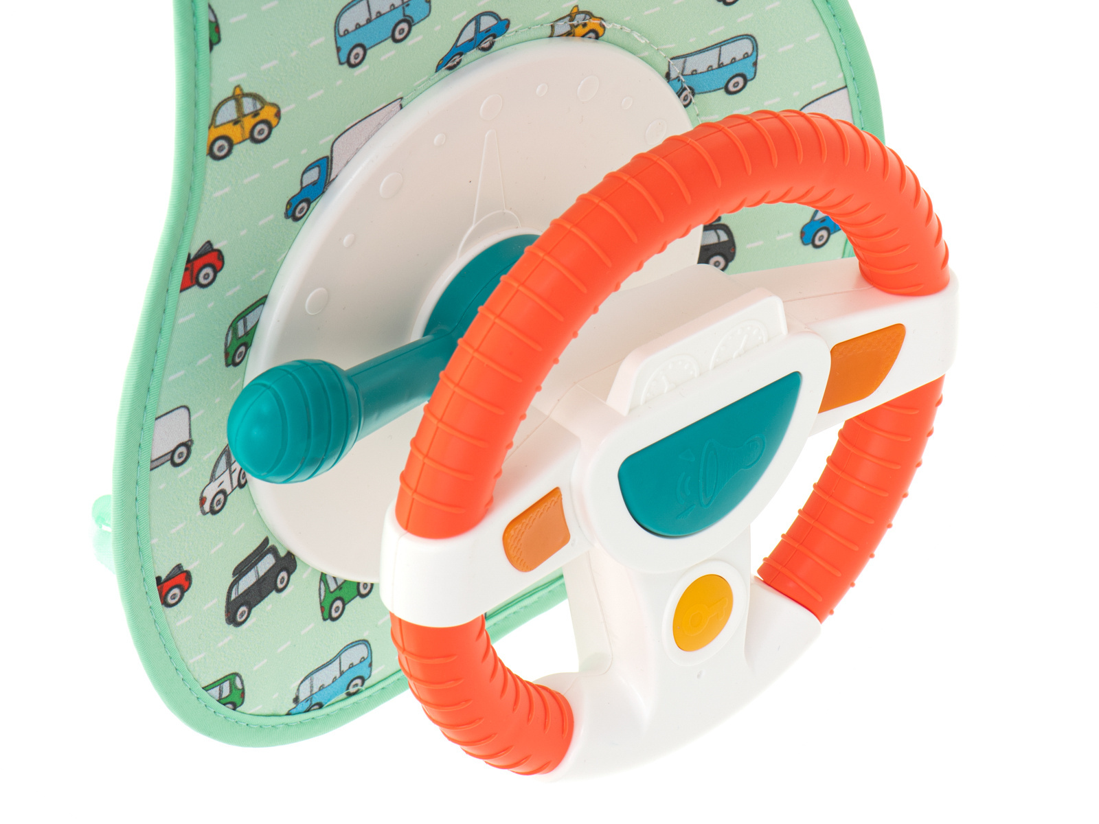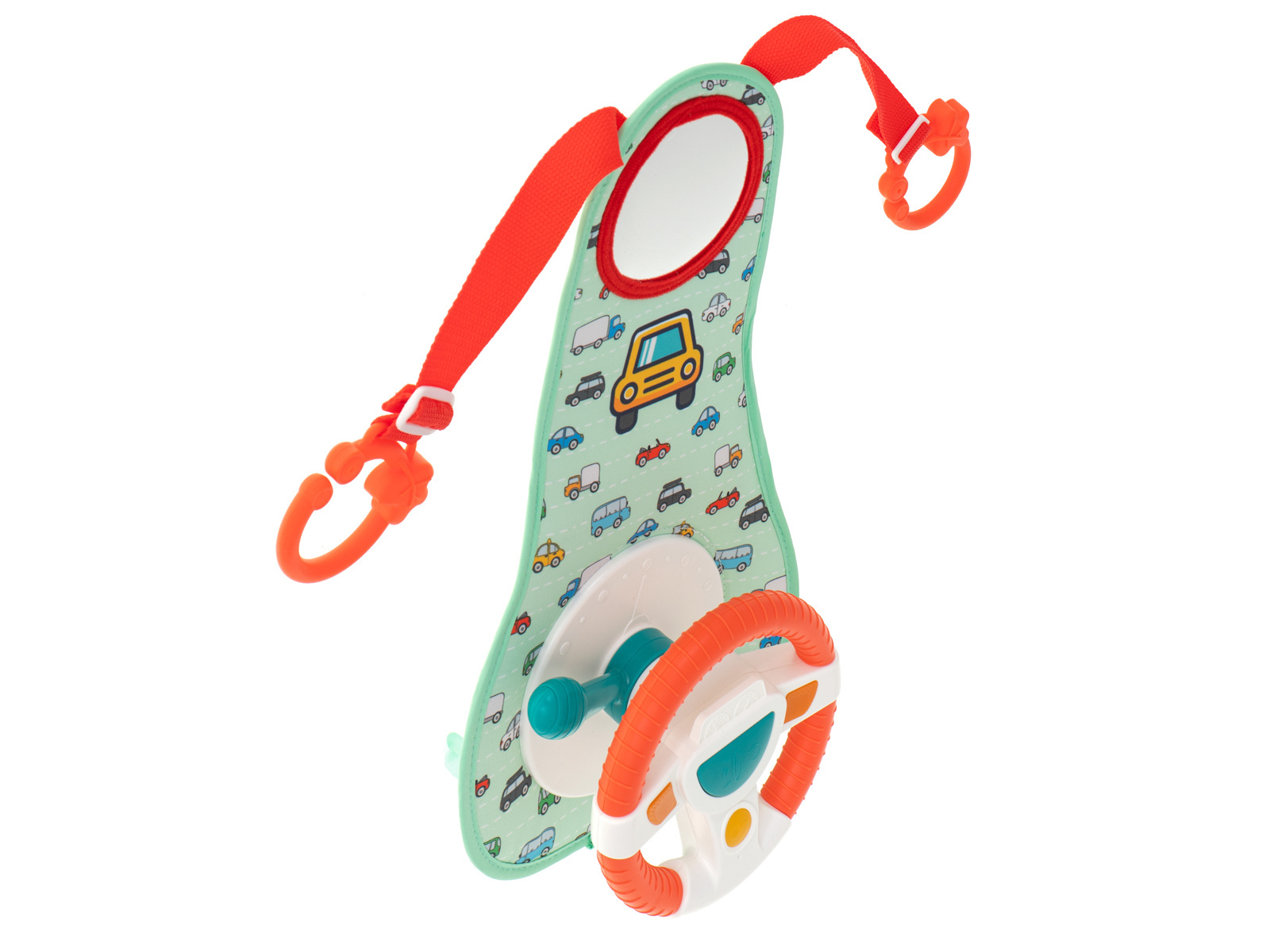 - Plastikowe kółka na regulowanych pasach umożliwiające przymocowanie zabawki do zagłówka przedniego siedzenia
