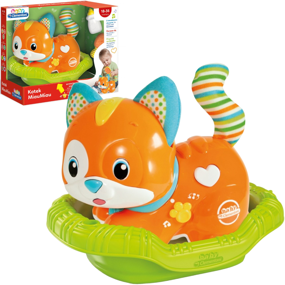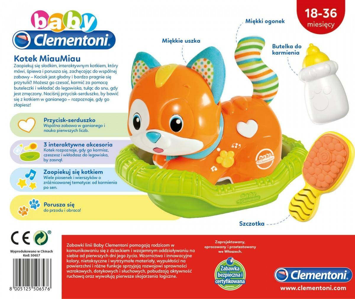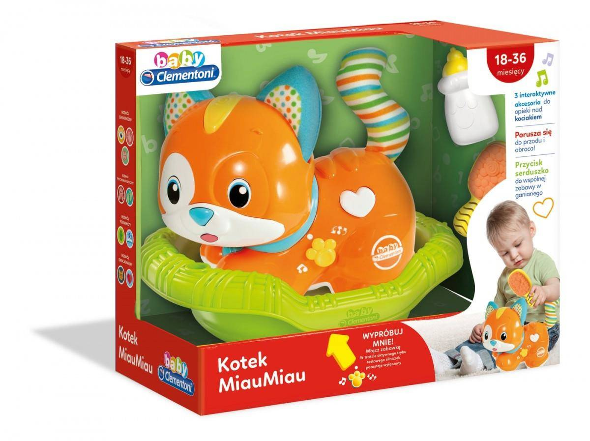 Wspaniała zabawa dla dziecka na długie godziny gwarantowana! Kotek może stać się nierozłącznym towarzyszem malucha. Dzięki efektom dźwiękowym, a także poruszaniu się zachęci do aktywności i zabawy. Kot potrzebuje troski, co może wywołać w dziecku poczucie odpowiedzialności i zaangażowania. Zabawa pozwoli na rozwinięcie wyobraźni maluszka. Kotek MiauMiau jest produktem znanej i lubianej przez dzieci marki Clementoni.POMARAŃCZOWY KOTEK MÓWI I ŚPIEWA WESOŁE PIOSENKI