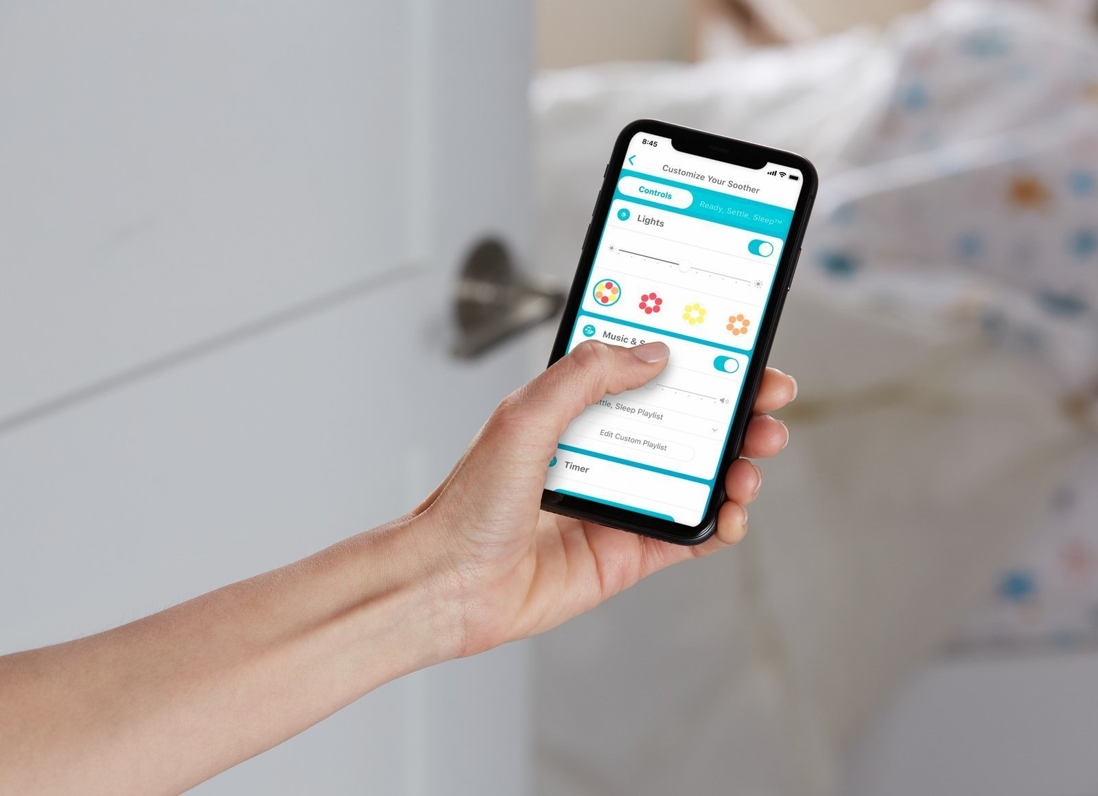 - 20 minut wyciszającej muzyki z 4 kojącymi dźwiękami ułatwiającymi zasypianie