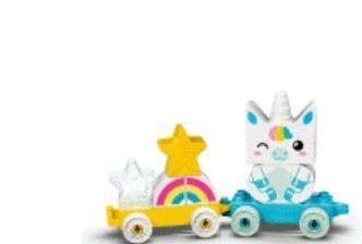 - Zestaw klocków DUPLO dla najmłodszych dzieci. W zestawie znajdziemy dwa wagoniki do przewożenia Jednorożca gwiazdek i tęczy.
