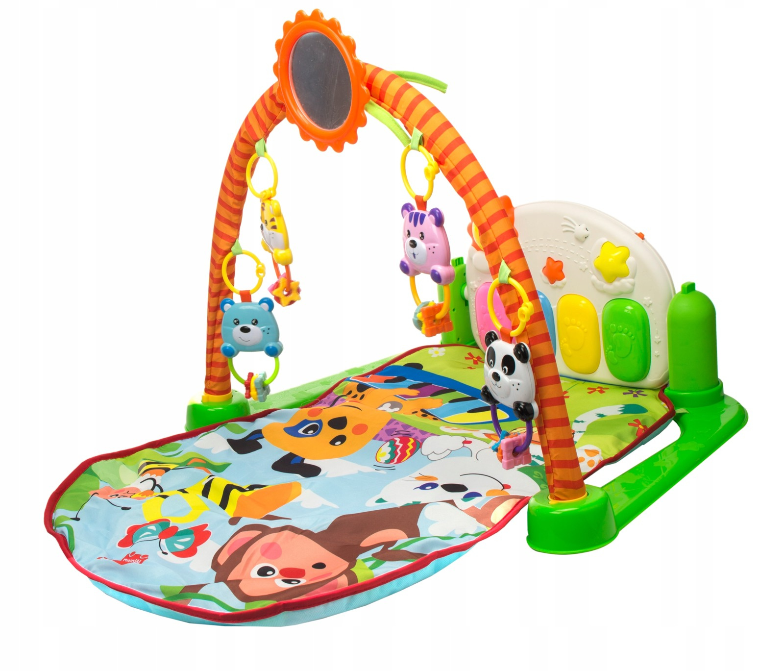 Taka kolorowa wielofunkcyjna mata edukacyjna umili czas Twojemu dziecku. Kolorowe, zawieszone na pałąku zabawki bez reszty pochłoną uwagę dziecka i wspomogą jego rozwój ruchowy, przy okazji dostarczając mu świetnej zabawy i okazji do śmiechu. Mata edukacyjna wyposażona jest w magiczne pianinko, które wydaje dźwięki, odgrywa melodyjki i w dodatku świeci kolorowymi światełkami. To świetna zabawa i nie tylko w domu.INTERAKTYWNA MATA Z GRZECHOTKAMI 3w1