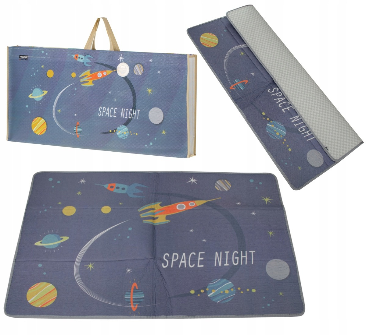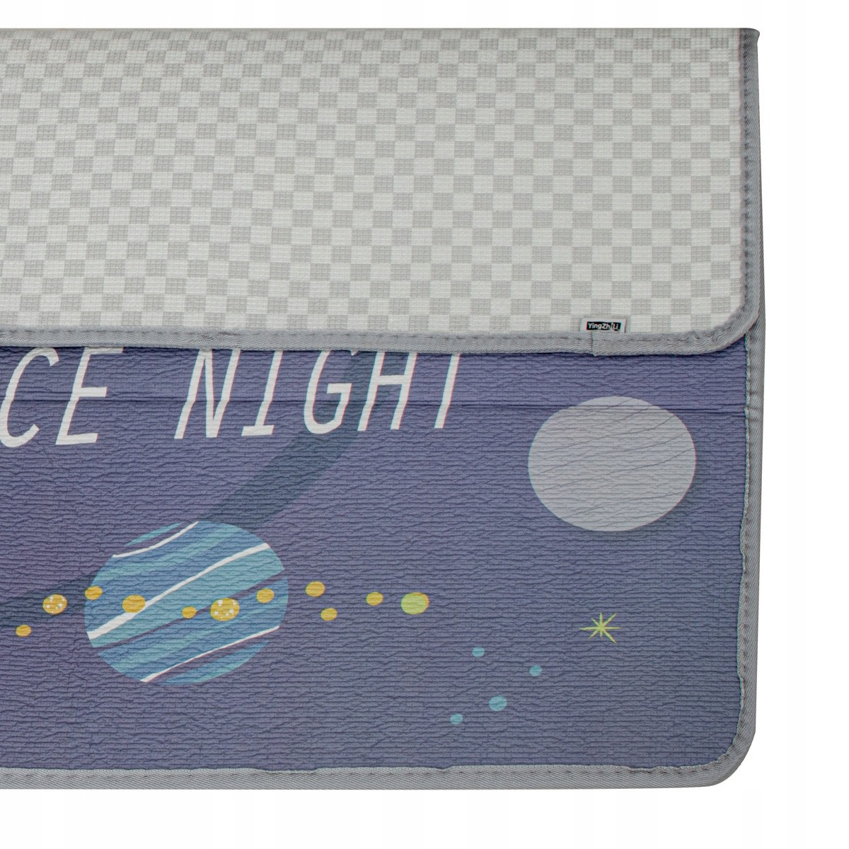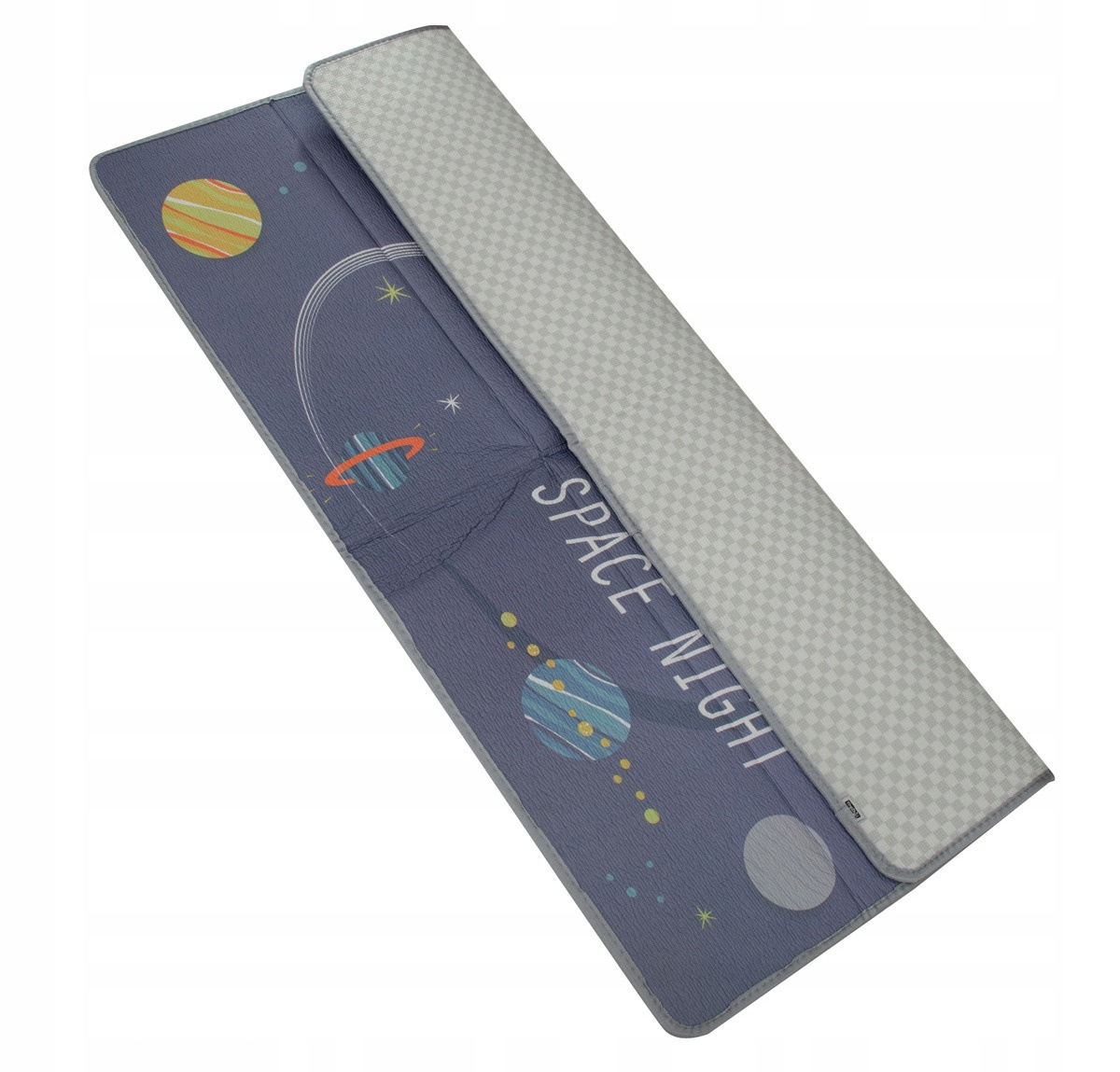 - Dwustronna mata edukacyjna z motywem kosmosu i biało-szarą kratką