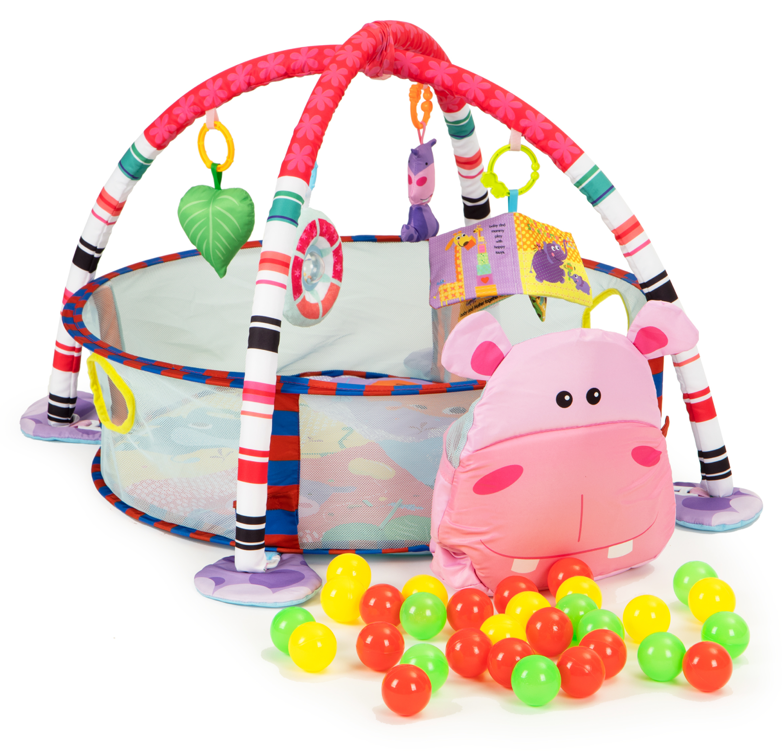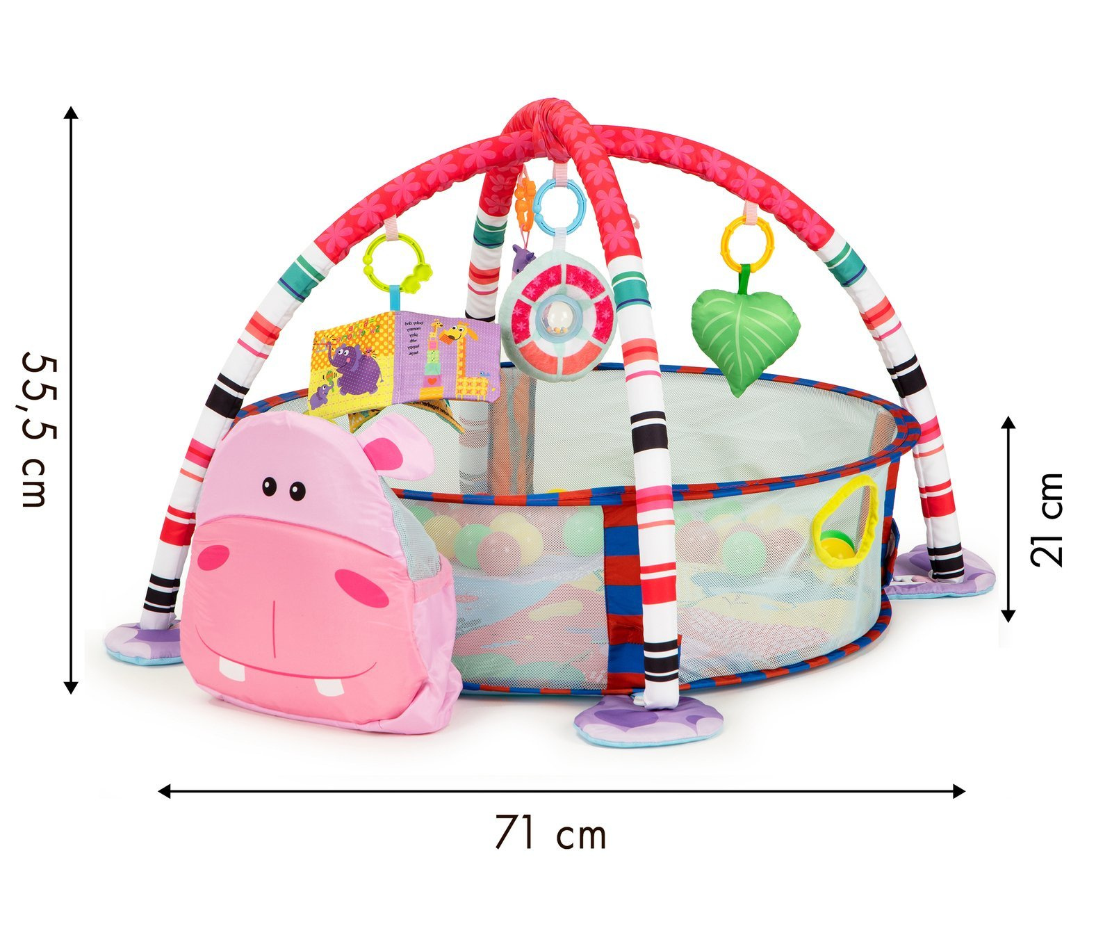 • Duża, wielofunkcyjna mata edukacyjna dla dzieci z motywem uroczego hipopotama, 4 maskotkami do powieszenia i zestawem 30 kolorowych piłeczek zapewni długie godziny zabawy podczas nauki lub słodkiego leniuchowania. Dla dzieci już od pierwszych chwil życia.