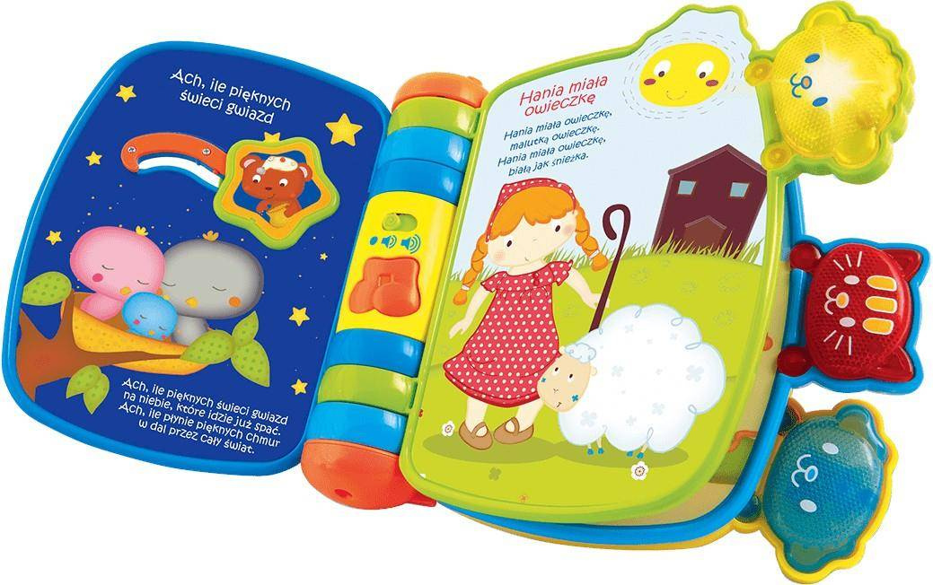 - Interaktywna książeczka da najmłodszych. Kolorowe światełka i wesołe dźwięki na pewno zainteresują dzieci.