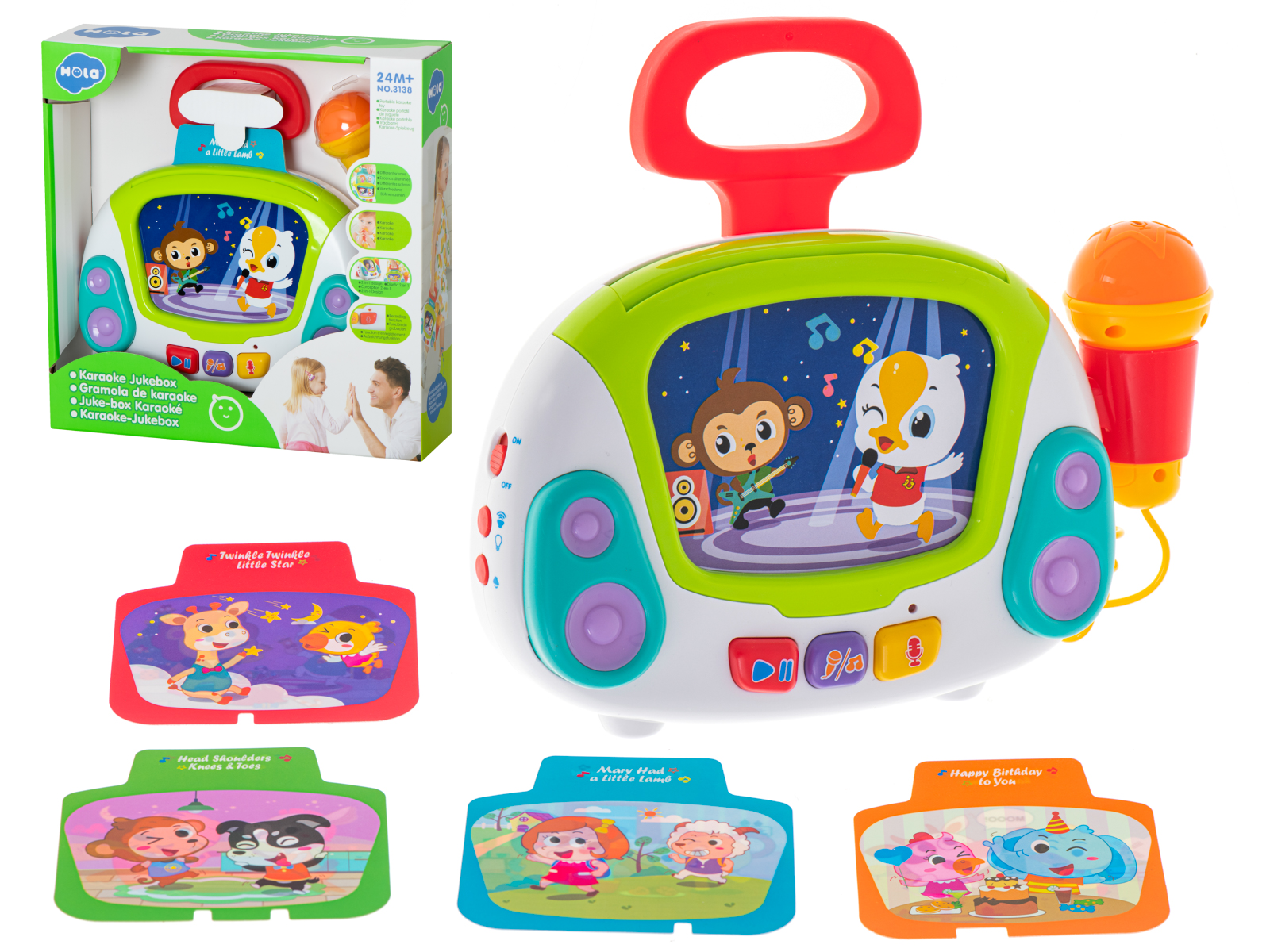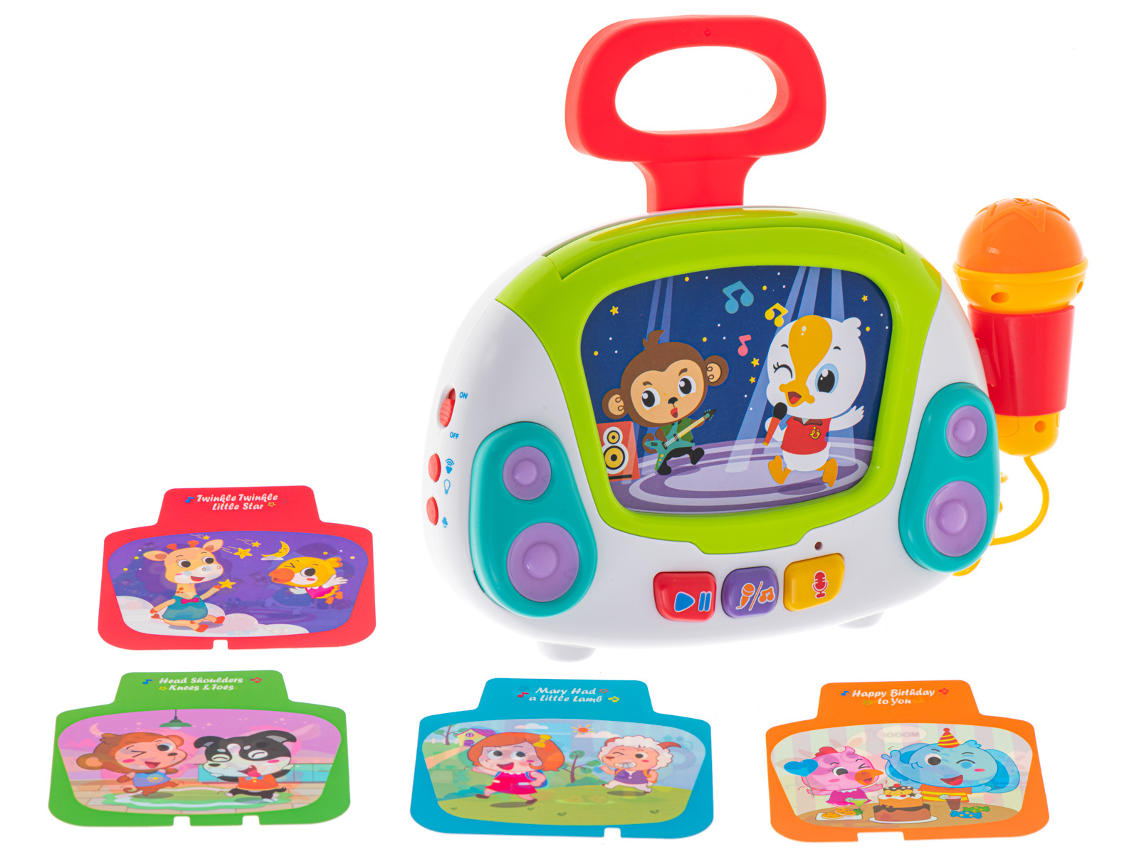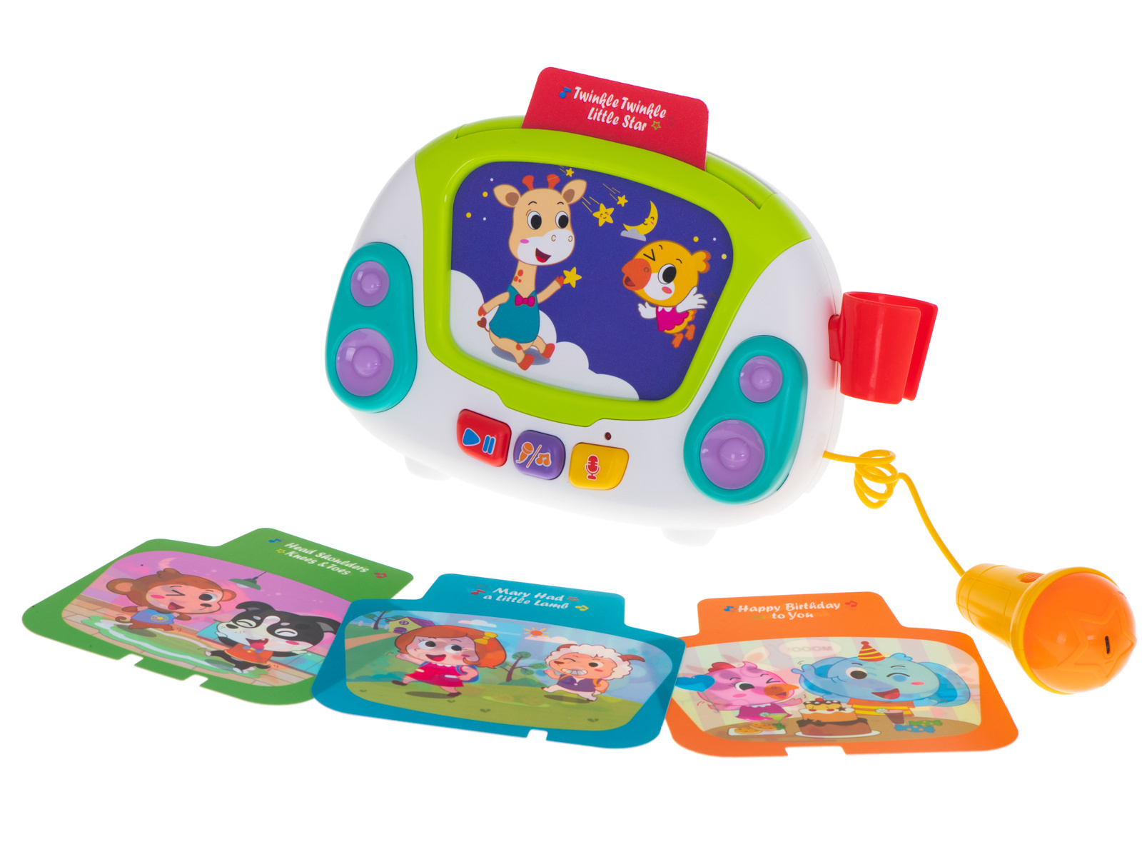 Poszukujesz niebanalnego pomysłu na prezent dla dziecka? Podaruj mu ogrom radości, wyjątkowy zestaw do karaoke. Muzyczna zabawka poza interaktywnym mikrofonem umożliwiającym nagrywanie muzyki, odtwarza również mnóstwo różnorodnych melodyjek pobudzających zmysły malucha. Do zestawu dołączono 9 obrazków przedstawiających zwierzęta i ludzi, a każdy z nich uruchamia inną piosenkę w języku angielskim. Całość jest niezwykle atrakcyjna dla dzieci dzięki barwnej kolorystyce i efektom. Zabawka pozbawiona jest ostrych krawędzi i drobnych elementów, przez co jest całkowicie bezpieczna nawet dla tych najmniejszych dzieciaków. Zobacz błysk szczęścia w oczach dziecka.DANE TECHNICZNE: