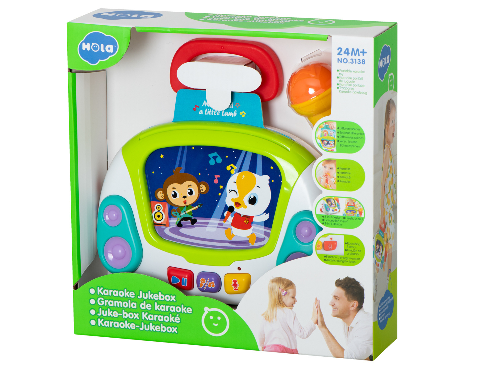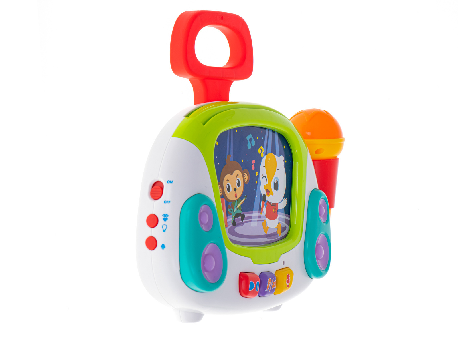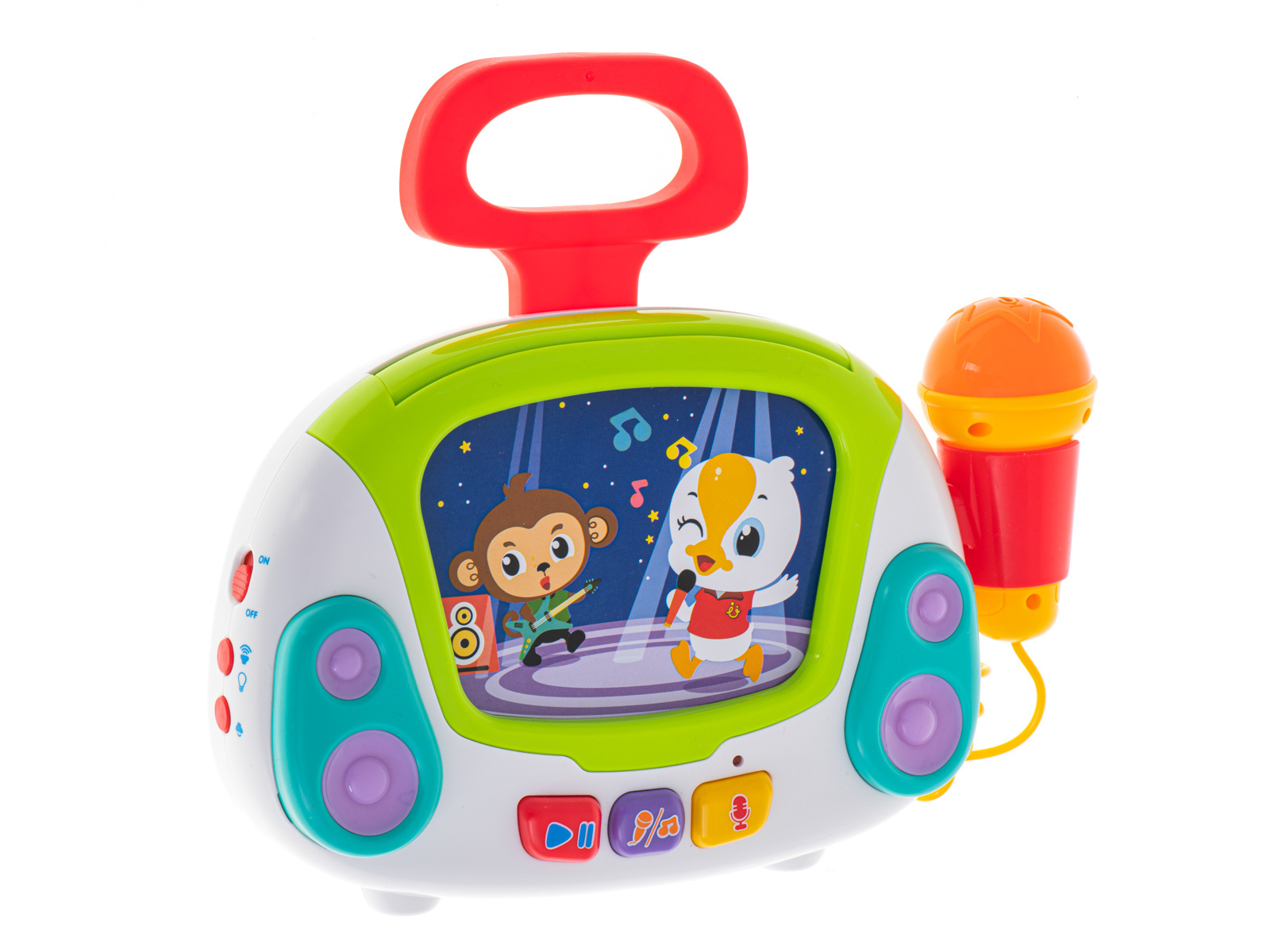 Poszukujesz niebanalnego pomysłu na prezent dla dziecka? Podaruj mu ogrom radości, wyjątkowy zestaw do karaoke. Muzyczna zabawka poza interaktywnym mikrofonem umożliwiającym nagrywanie muzyki, odtwarza również mnóstwo różnorodnych melodyjek pobudzających zmysły malucha. Do zestawu dołączono 9 obrazków przedstawiających zwierzęta i ludzi, a każdy z nich uruchamia inną piosenkę w języku angielskim. Całość jest niezwykle atrakcyjna dla dzieci dzięki barwnej kolorystyce i efektom. Zabawka pozbawiona jest ostrych krawędzi i drobnych elementów, przez co jest całkowicie bezpieczna nawet dla tych najmniejszych dzieciaków. Zobacz błysk szczęścia w oczach dziecka.DANE TECHNICZNE: