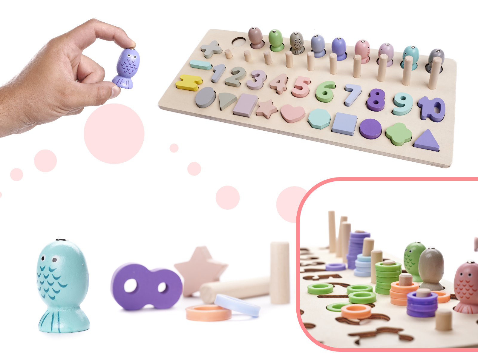 Opinie o Drewniana zabawka edukacyjna dla dzieci Liczydło z sorterem Kształty i cyfry Łowienie rybek 2w1