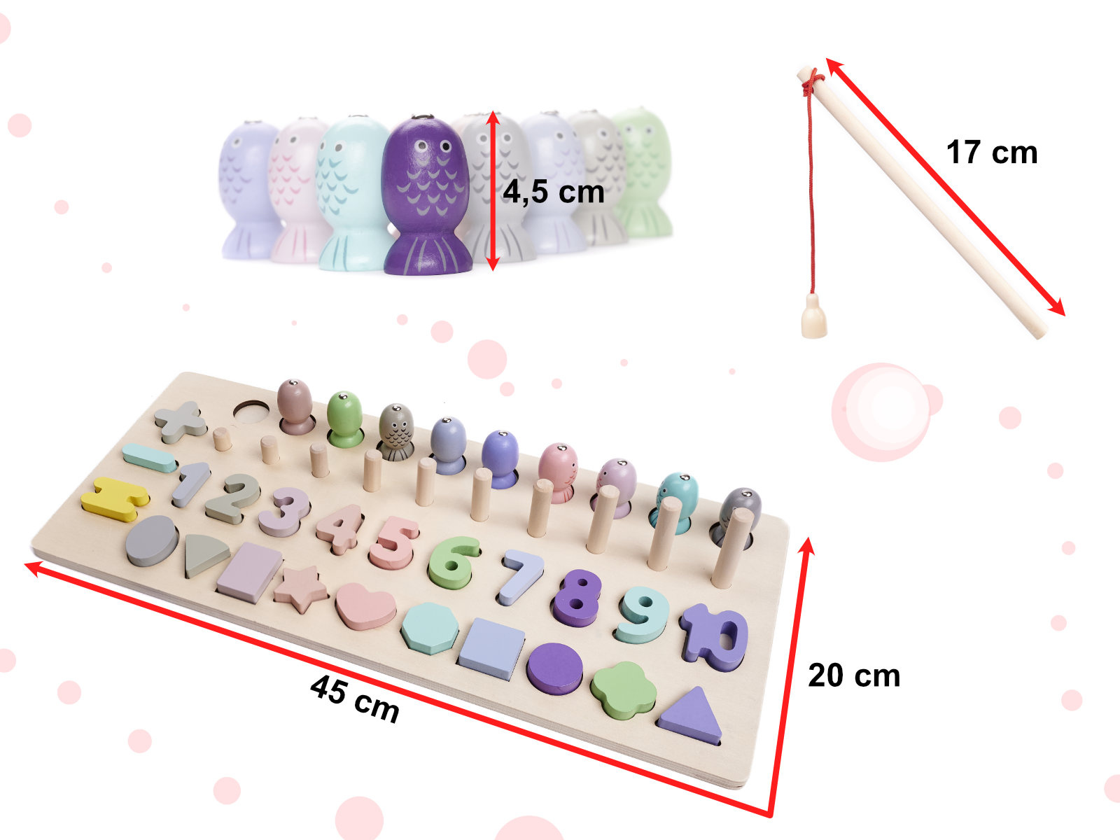 Drewniana zabawka edukacyjna dla dzieci Liczydło z sorterem Kształty i cyfry Łowienie rybek 2w1