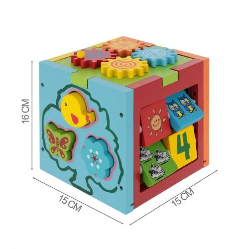 Nauka kolorów, cyfr oraz zwierzątek może być coraz prostsza. Dzięki sorterowi z różnymi drewnianymi klockami, dziecko nauczy się rozróżniania kształtów. Zadaniem malucha jest dopasowanie klocka do odpowiedniego otworu w kostce. Na pozostałych ściankach znajdują się obracające tabliczki, ruszające się trybiki oraz suwaki. Barwna kolorystyka zwróci uwagę dziecka i zachęci do zabawy. Podczas zabawy dziecko rozwinie zdolności manualne oraz koordynację ręka-oko.DANE TECHNICZNE
