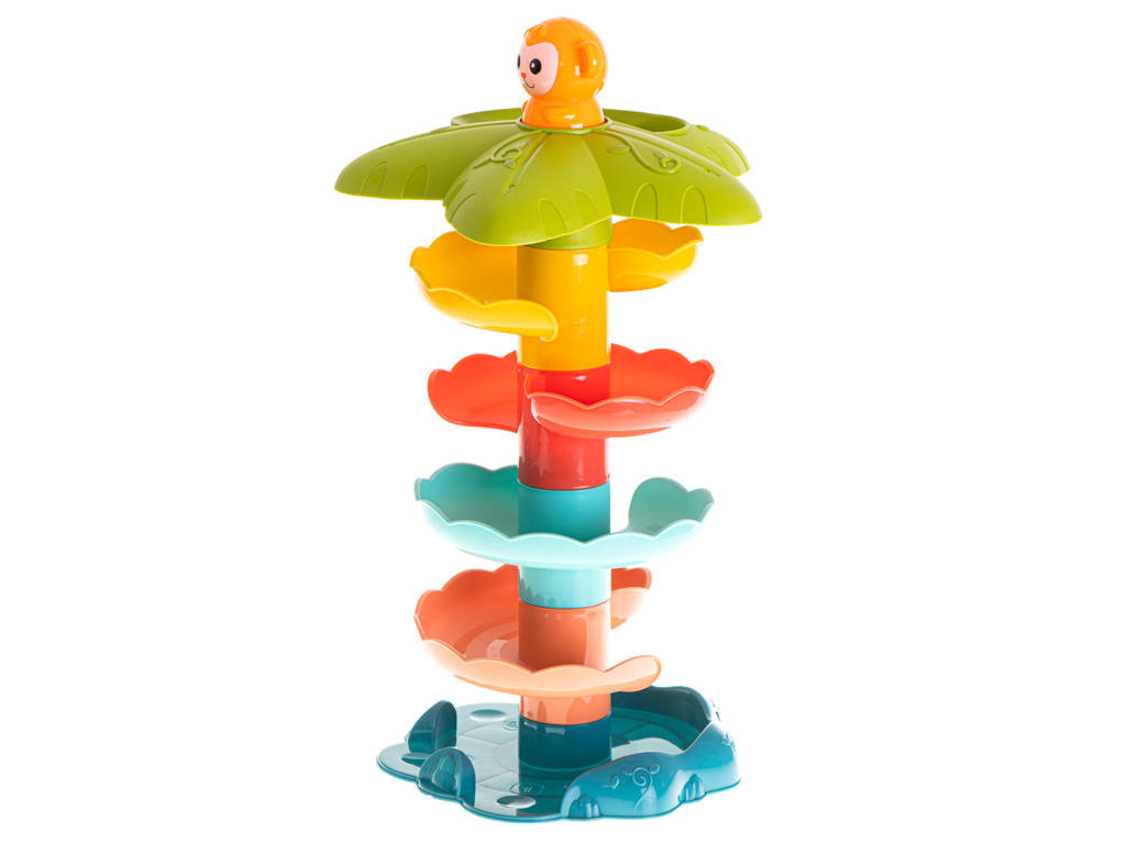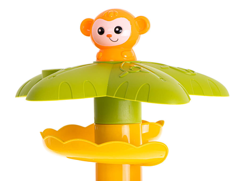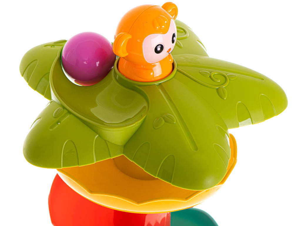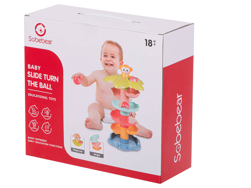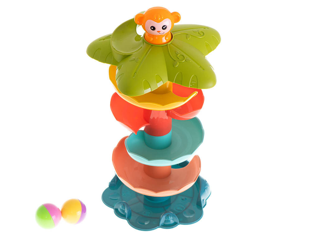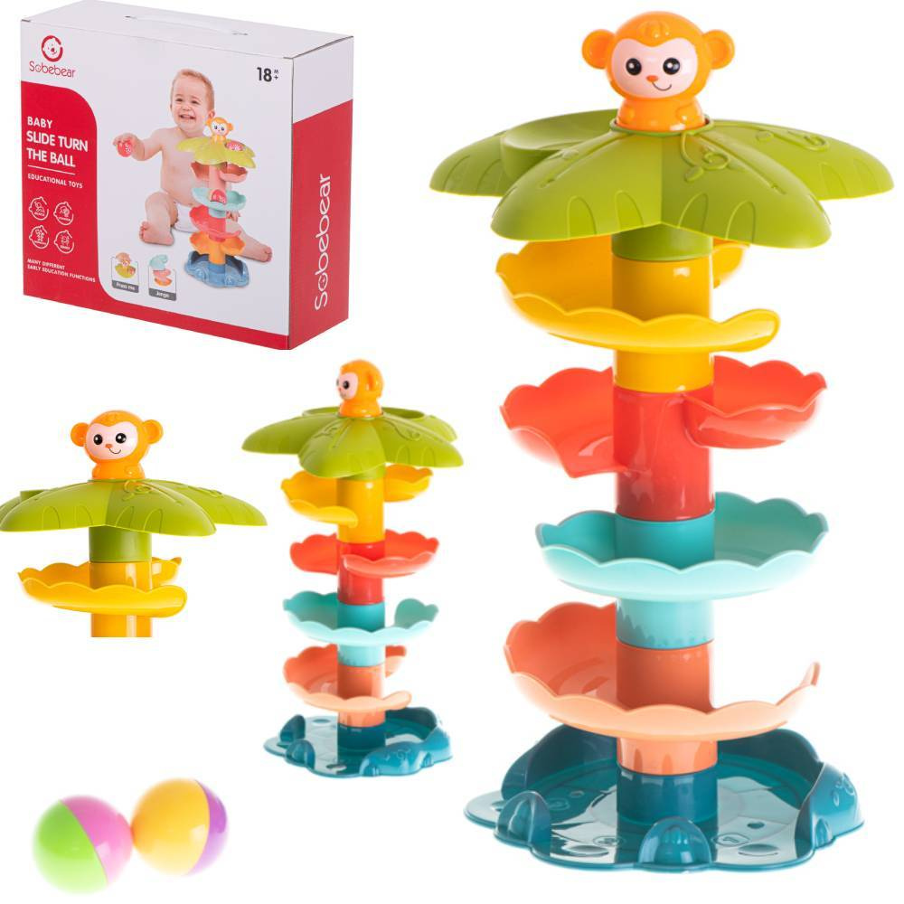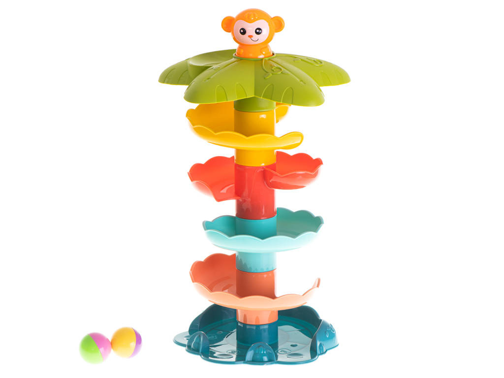 Zjeżdżalnia dla kuleczek posiada żywe kolory, które przyciągną uwagę dziecka. W zestawie znajdują się dwie piłeczki, które aby zaczęły się turlać należy umieścić na samej górze wieży. Kulka zatrzyma się na zapadce, a wtedy do gry wchodzi małpka, którą należy nacisnąć. Kuleczka w mig rozpocznie swoją szybką podróż. Sorter pokazuje i uczy zachowania się okrągłych przedmiotów oraz pochyłych powierzchni. Możliwość zabawy już od 18 miesiąca życia.DANE TECHNICZNE