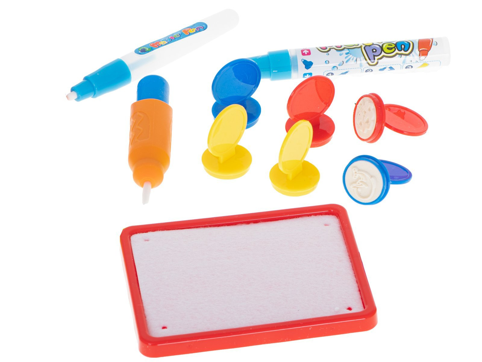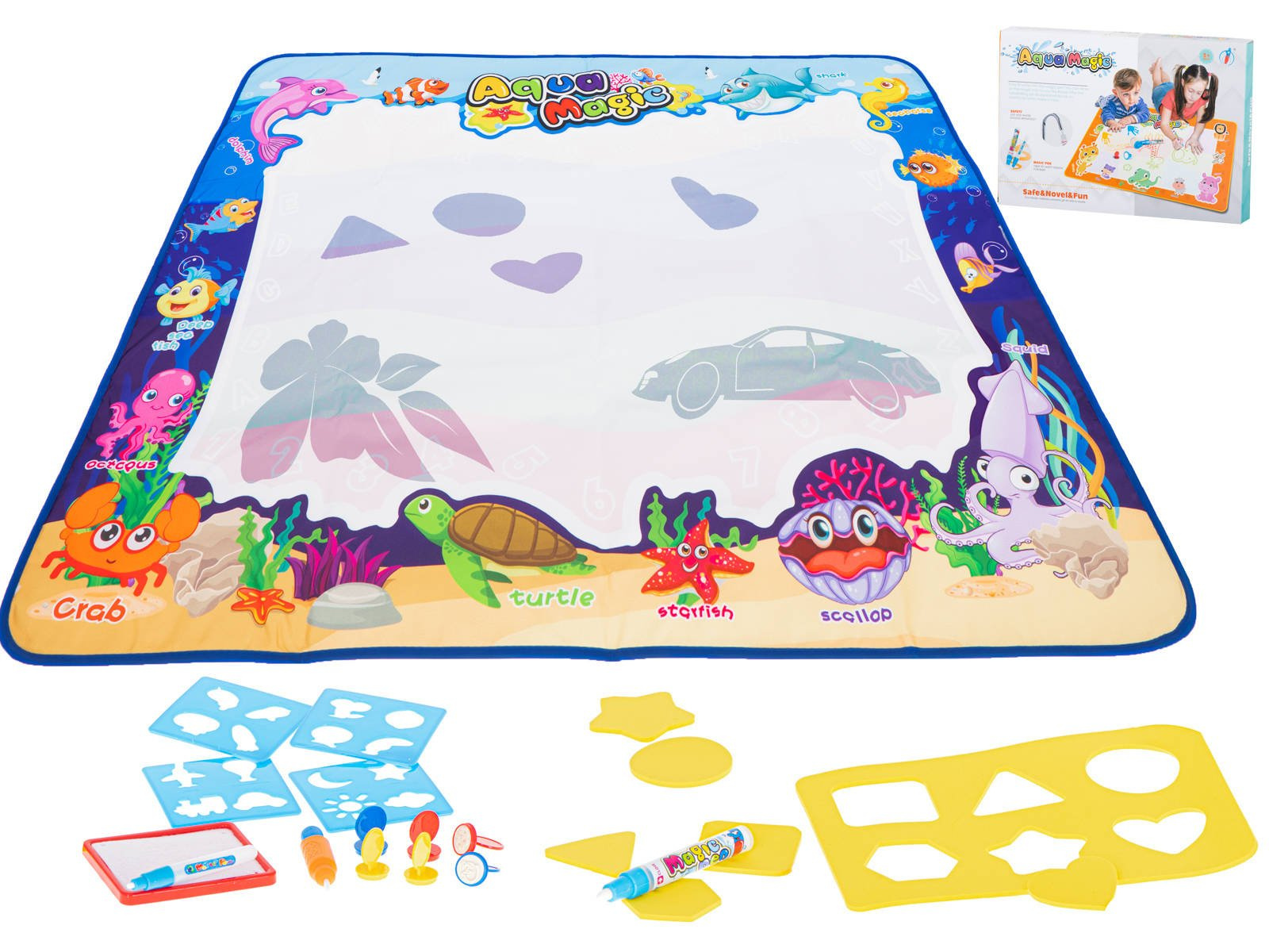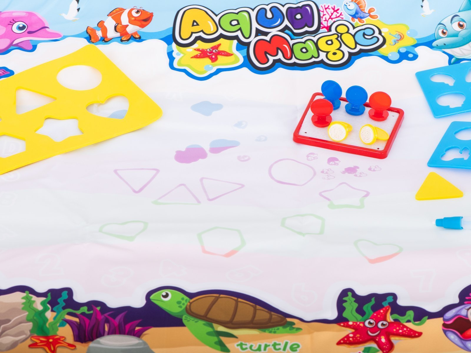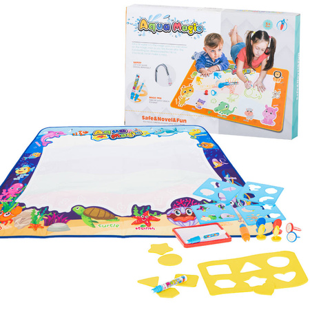 W zestawie znajduje się specjalny mazak, który daje możliwości rysowania po macie, natychmiast po wypełnieniu go wodą. Znajdziesz również zestaw szablonów, dzięki którym, na macie, będzie można odrysować ciekawe kształty. Z kształtów można wyczarować cudne rysunki. Jakby tego było mało, to są tutaj również specjalne stempelki. Wystarczy namoczyć je wodą, na specjalnej podkładce i natychmiast używać na dużej powierzchni maty.Zawartość zestawu: