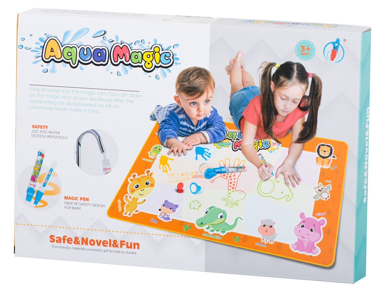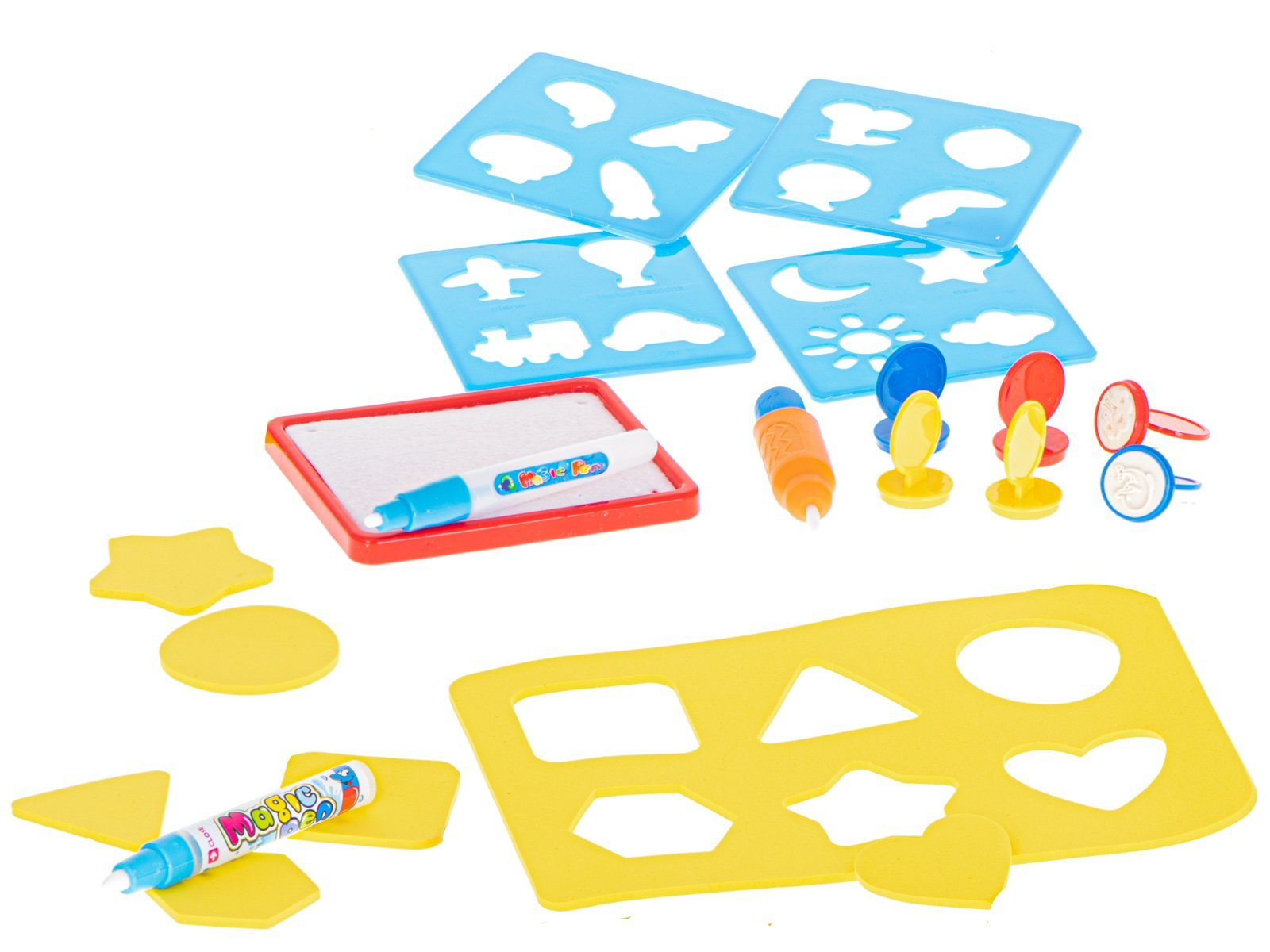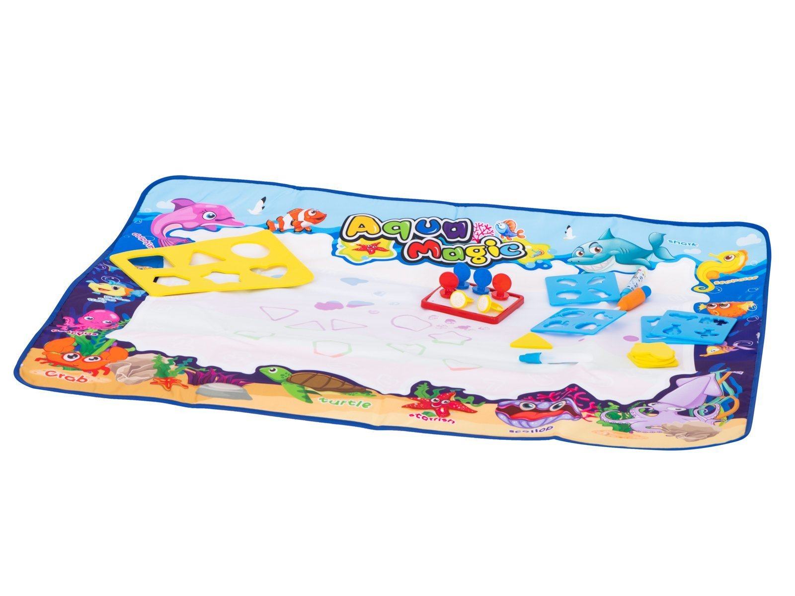 W zestawie znajduje się specjalny mazak, który daje możliwości rysowania po macie, natychmiast po wypełnieniu go wodą. Znajdziesz również zestaw szablonów, dzięki którym, na macie, będzie można odrysować ciekawe kształty. Z kształtów można wyczarować cudne rysunki. Jakby tego było mało, to są tutaj również specjalne stempelki. Wystarczy namoczyć je wodą, na specjalnej podkładce i natychmiast używać na dużej powierzchni maty.Zawartość zestawu:
