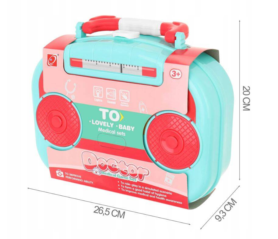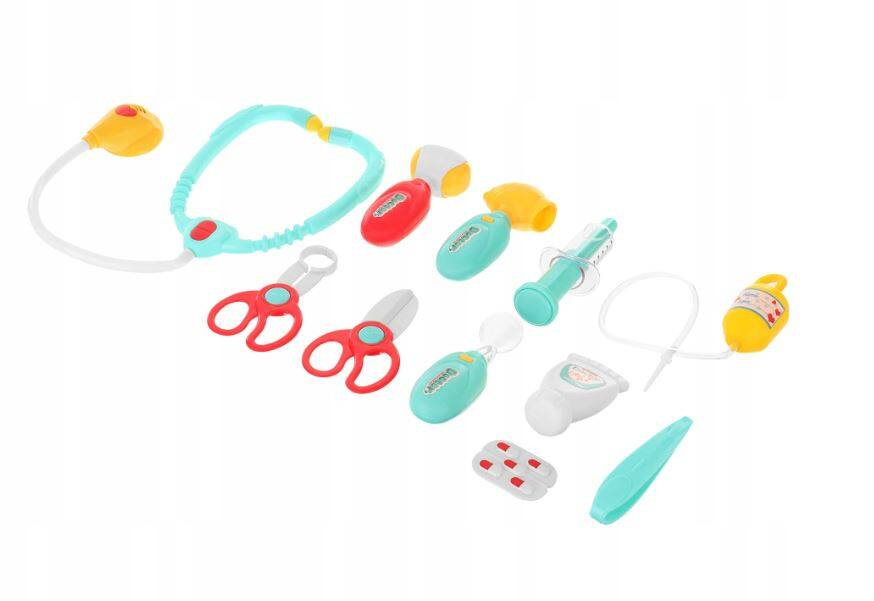 Zestaw małego doktora składa się z 13 elementów. Znajdziemy w nim m.in. stetoskop, strzykawkę, młoteczek oraz zabawkowe tabletki. Wszystkie elementy zestawu zostały znajdą swoje miejsce w poręcznym kuferku. Dzięki temu mały doktor może mieć zawsze swój zestaw przy sobie. Żywa kolorystyka zestawu z pewnością zwróci uwagę dziecka i zachęci je do wykonywania badań. Zestaw lekarski jest idealnym pomysłem na prezent zarówno dla chłopca, jak i dziewczynki.DANE TECHNICZNE