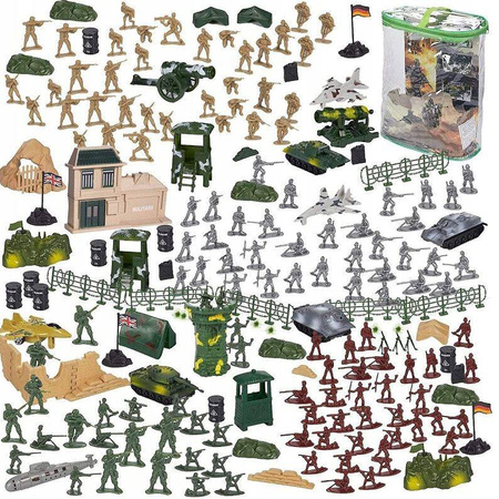 Jeśli Twoje dziecko jest zafascynowane wojskiem lub dopiero rozpoczyna swoją przygodę z militariami, to świetnie się składa. Duży zestaw żołnierzyków składa się z aż 300 elementów, znajdziemy w nim między innymi żołnierzyki w dwóch wielkościach, bazy wojskowe, okopy, namioty i wieżyczki strażnicze. Więksi żołnierze są w kolorze zielonym oraz beżowym, natomiast mniejsi w kolorze zielonym, czerwonym oraz srebrnym. Wszystkie elementy zestawu są spakowane w poręczną torbę, zasuwaną na zamek. Dzięki temu żołnierzyki mogą zostać zabrane w każde miejsce.ZESTAW WOJSKOWY ARMIA DLA DZIECKA
