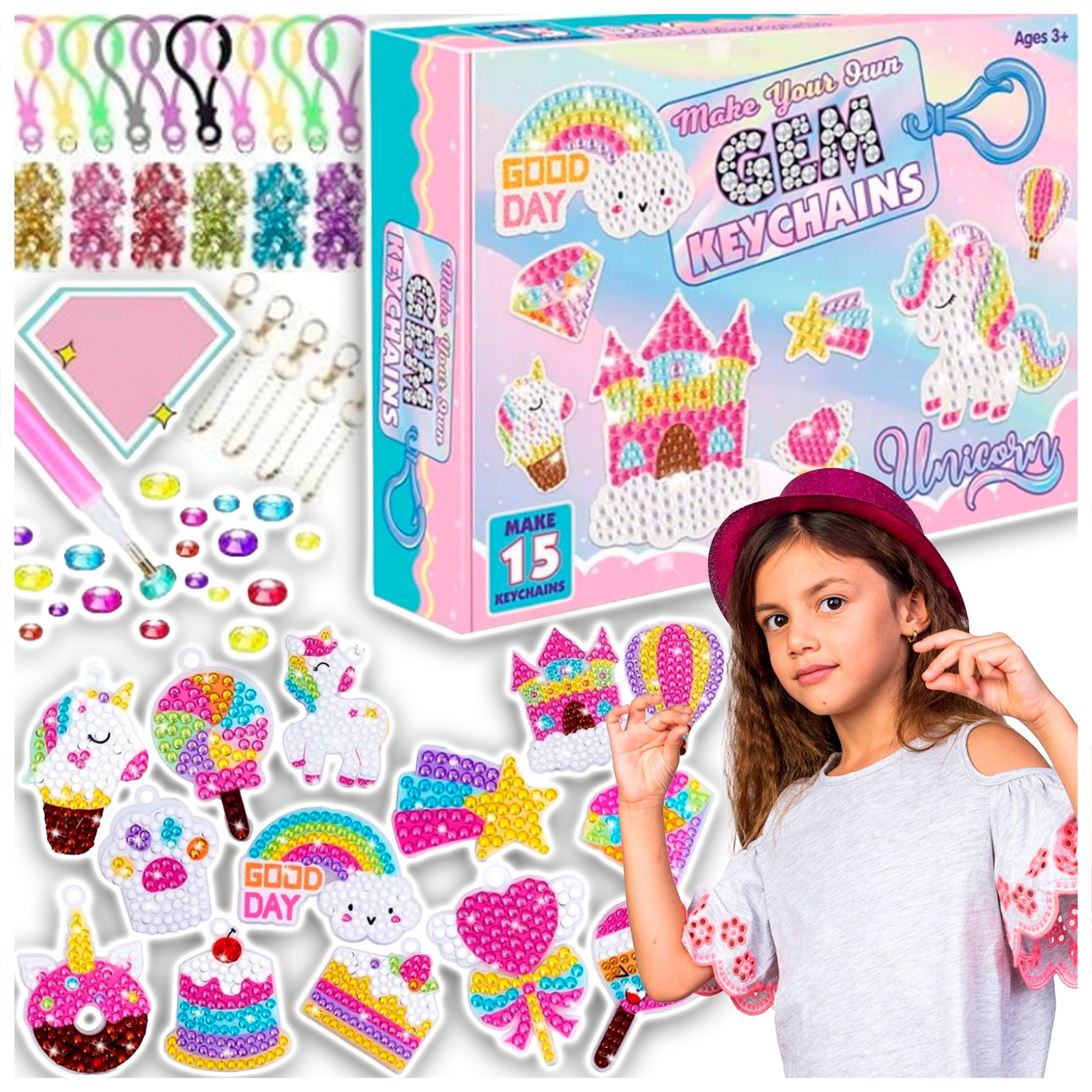 - Zestaw kreatywny z haftem diamentowym do tworzenia breloczków. Dokonały pomysł na prezent dla dzieci lubiących prace artystyczne. Wyjątkowe breloczki przedstawiają m.in. jednorożce, tęcze oraz serca.