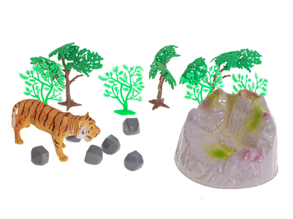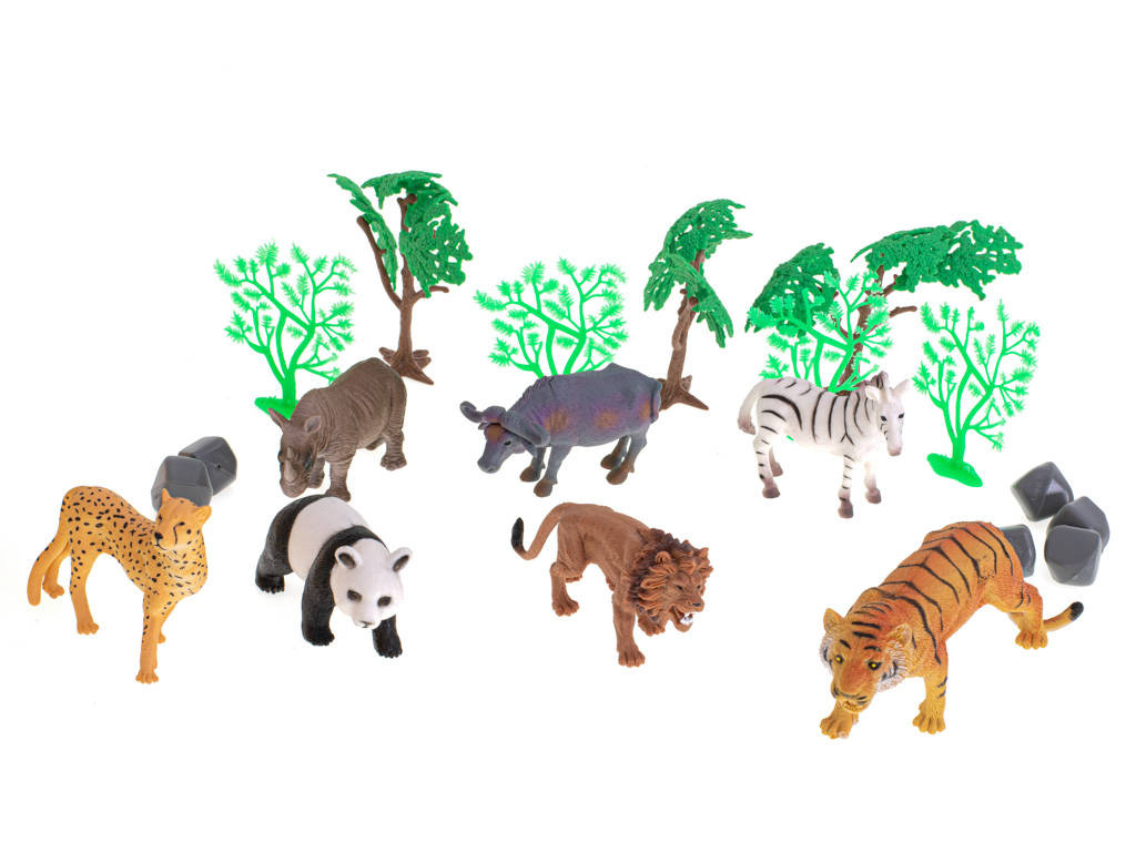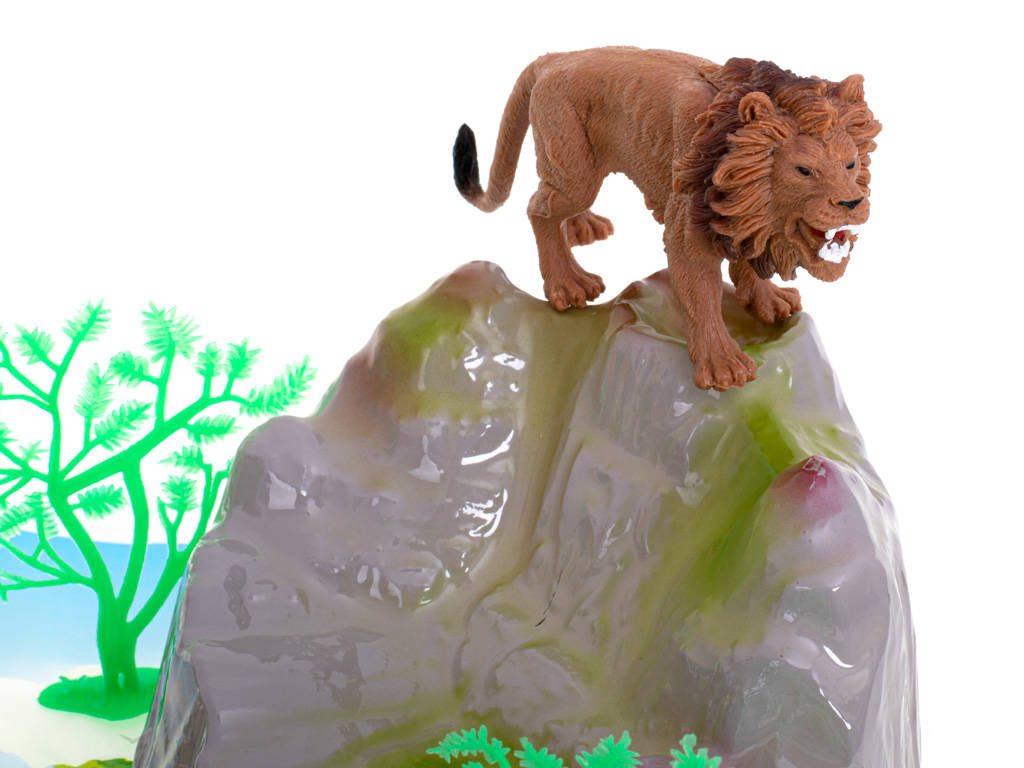 Figurki zwierzątek same w sobie są rewelacyjne, ale w zestawie znajdują się również inne ciekawe dodatki. Są to trzy drzewka, cztery krzewy, a także sześć kamieni. Te nieodłączne w naturze części przyrody, można porozkładać na kolorowej macie, która wprost idealnie oddaje naturalne środowisko zwierzaków. Mogą swobodnie dotrzeć do rzeki, która zaspokoi ich pragnienie... Zabawa bez końca. A po zakończeniu, zwierzątka mogą znaleźć odpoczynek w plastikowym wiadereczku, skąd zapewne nie uciekną.Przykładowe wymiary:
