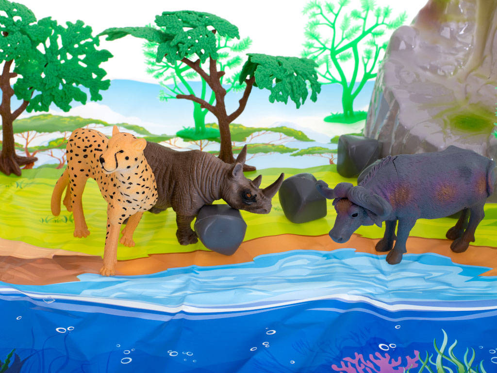 - Zestaw figurek zwierząt z terenów afrykańskich wraz z dodatkowymi akcesoriami. Do zabawy dla dzieci od lat 3