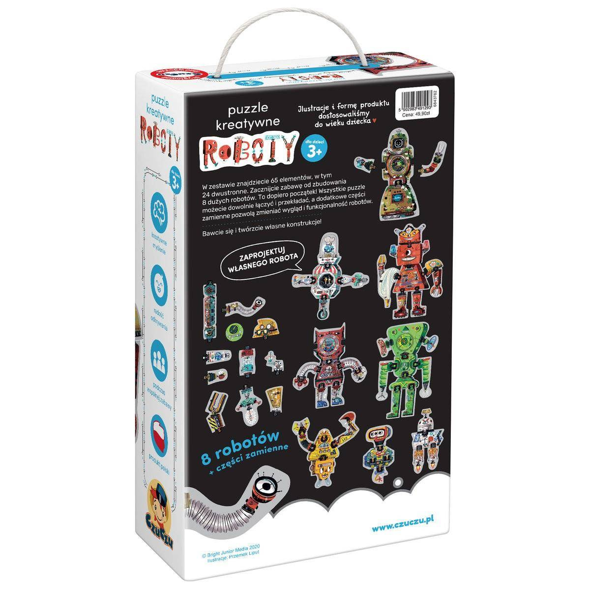 Puzzle kreatywne Roboty to zestaw 8 dużych układanek oraz dodatkowe elementy będące częściami zamiennymi. Wszystkie elementy pasują do siebie co pozwala dziecku na tworzenie własnych konstrukcji i dowolne modyfikacje ulepszające. Opisujcie co widać na obrazkach i zastanówcie się do czego będą potrzebne poszczególne części. Stwórzcie wyspecjalizowane roboty dla strażaków lub kosmonautów.Z PUZZLAMI KREATYWNYMI OD CZUCZU TWÓRZ NIEOCZYWISTE POŁĄCZANIA