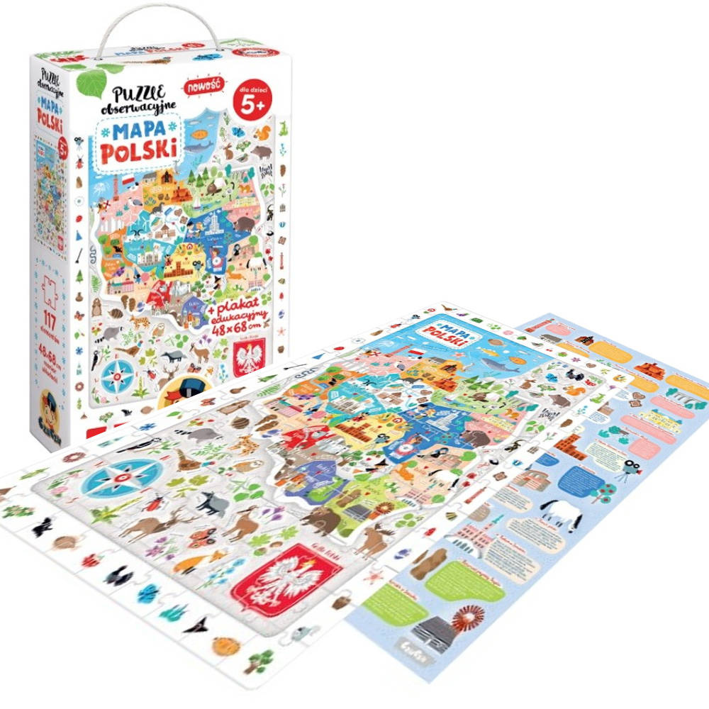 - Duże puzzle edukacyjne dla przedszkolaków i starszych dzieci. Po ułożeniu 117 kawałków otrzymujemy duże 68x48 cm obrazek z mapą Polski. Załączony do zestawu plakat zachęca do poszerzenia wiedzy o naszym kraju. Dla dzieci od lat 5
