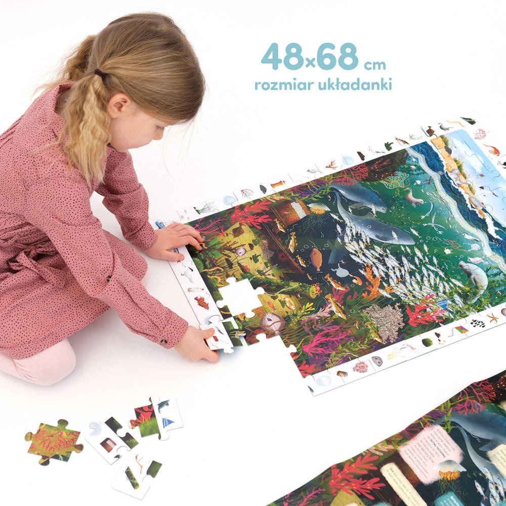 Dodatkowo do zestawu dołączony jest plakat zwierający wiele ciekawych informacji. Sprawdźcie, które zwierzęta morskie już znacie i ile znajdziecie bursztynów? Ile zwierząt skrywa się w morskiej głębinie? Kto potrafi wymienić więcej gatunków? Ilustracje i forma zostały dostosowane do wieku dzieci. Zestaw będzie ciekawym prezentem na dzień dziecka lub urodziny dla przyrodnika i miłośnika puzzli.- Opakowanie zawiera puzzle z 84 elementów i plakat edukacyjny
