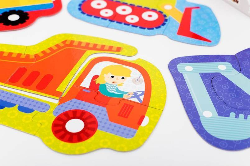 - Zestaw 4 obrazków do ułożenia z 4, 5, 6 i 7 elementów o tematyce pojazdów budowlanych. Dla dzieci od lat 2.