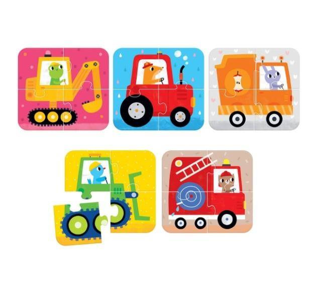 - 5 układanek z czterech elementów. Idealne dla najmłodszych dzieci. Kolorowe pojazdy ze zwierzątkami interesują nie tylko chłopców.